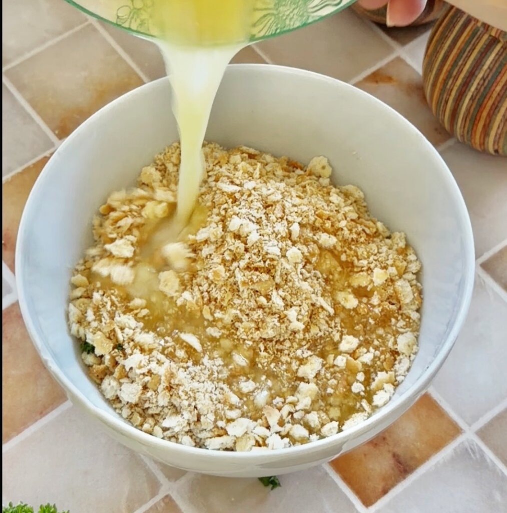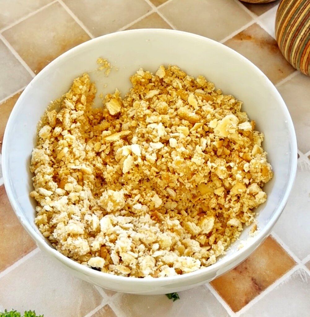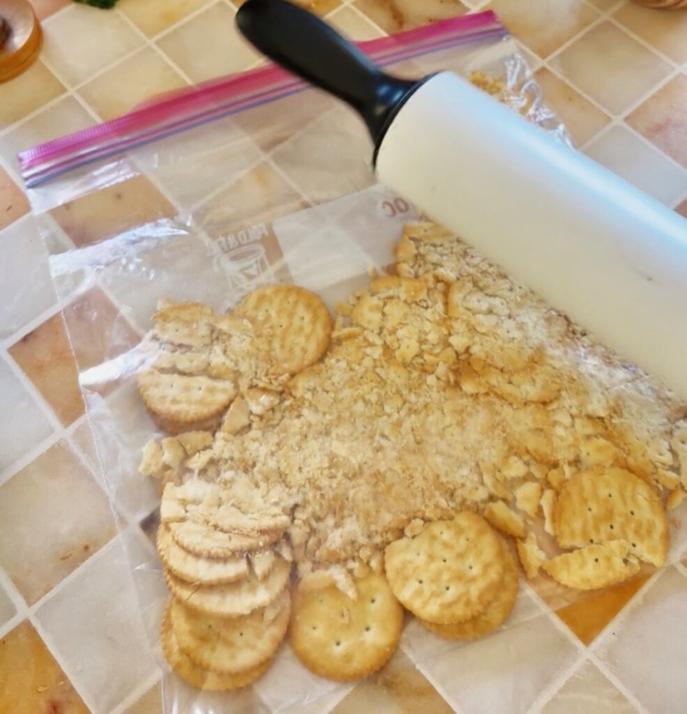 - Smash the crackers in a large zip lock bag using a rolling pin. Pour into a bowl and stir in the melted butter.