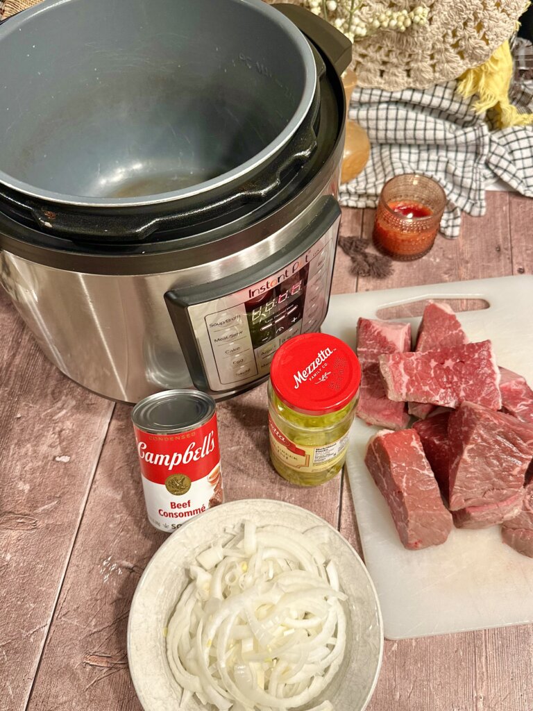 Add in the sliced onions, pepperoncinis with the 1/4 cup juice and the can of Beef Consommé.