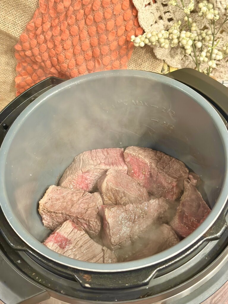 - Cut up the roast into large 3-4 inch chunks. Season the beef pieces with the salt, pepper and garlic powder. Set an electric pressure cooker to the sauté setting. Drizzle the olive oil in the pot of the pressure cooker. Place the beef in the Instapot and brown the pieces on all sides. Use a fork or tongs to turn the pieces.