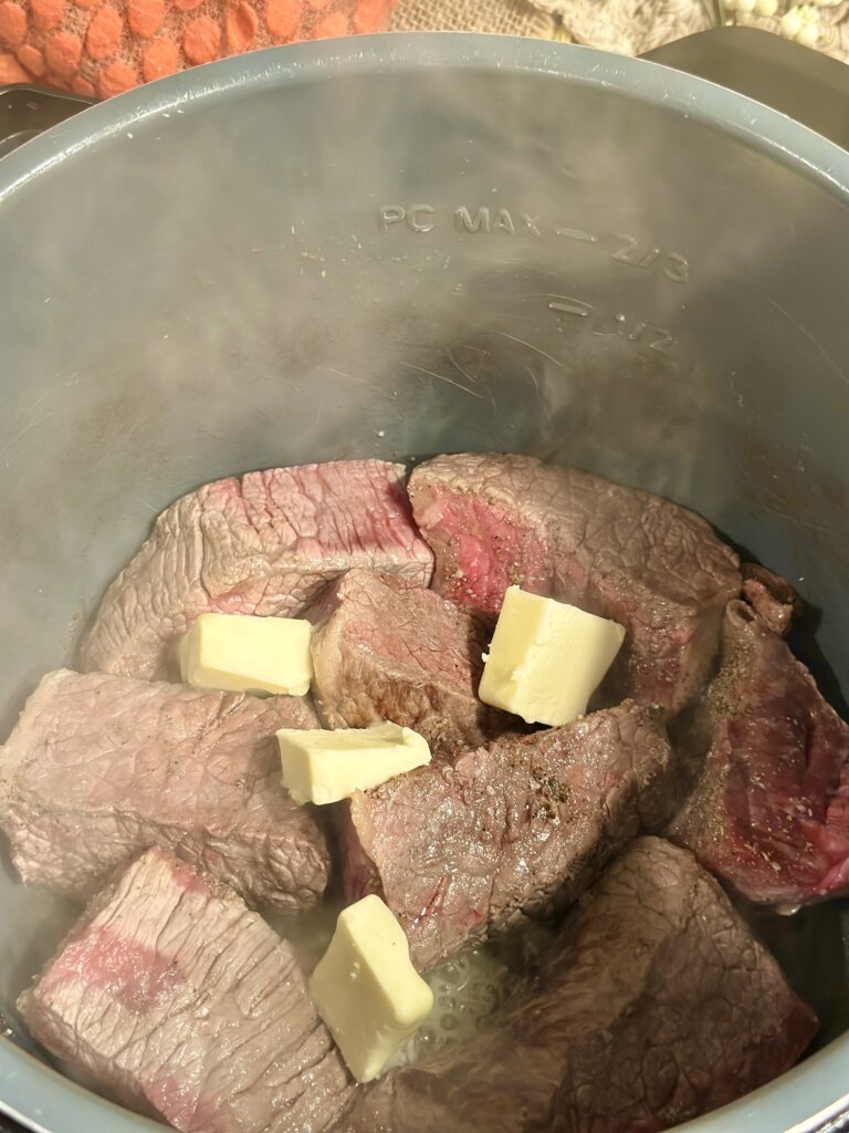 Season the beef with kosher salt, black pepper and garlic powder. Turn the pieces as they brown in the pot. Turn the sauté setting off. Add the 4 Tablespoons of butter to the beef.