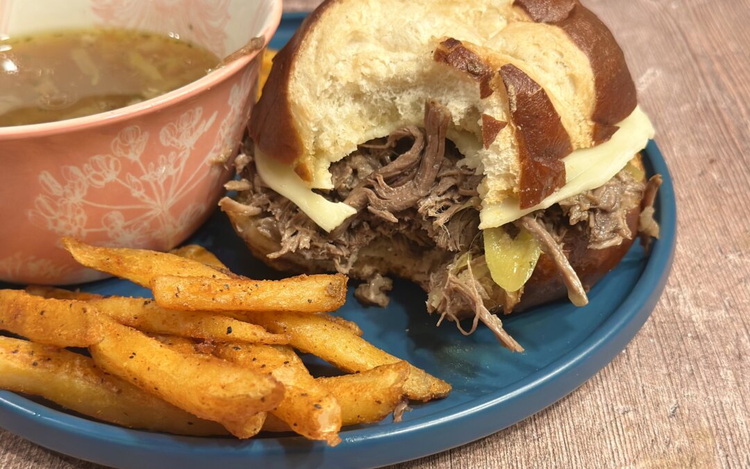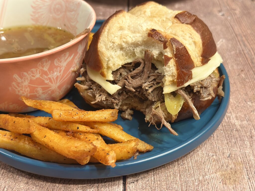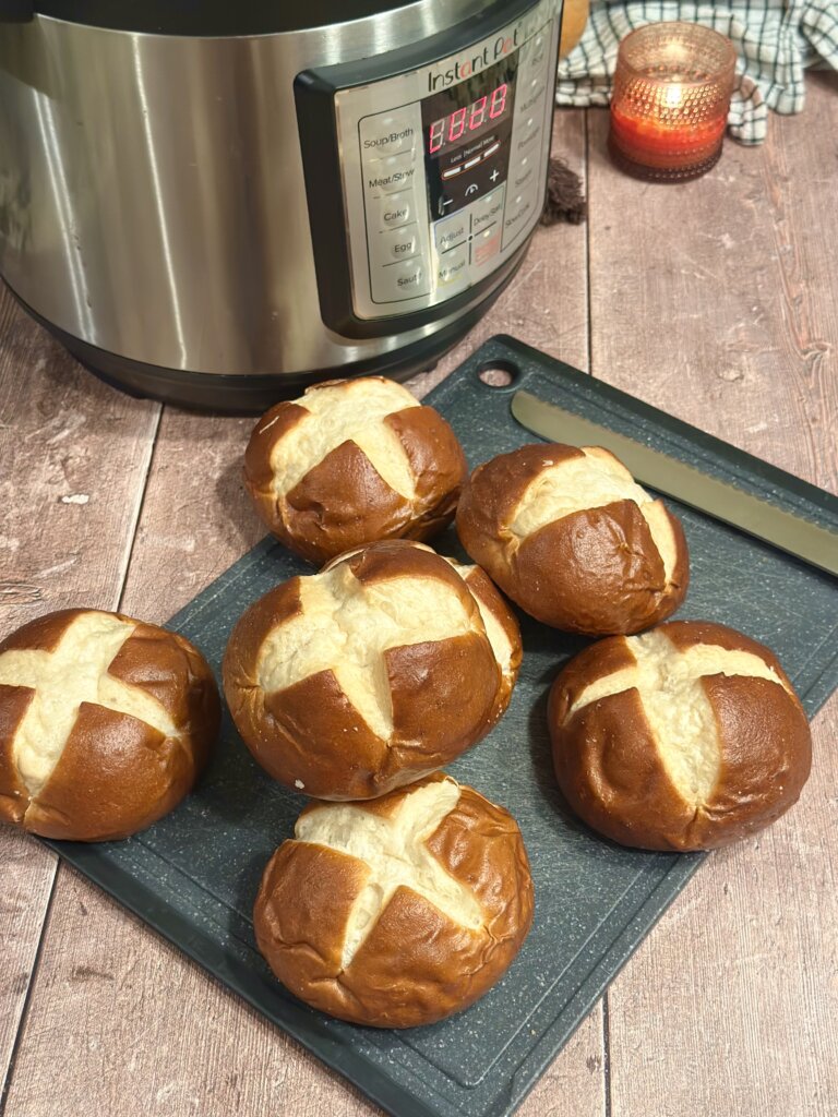 Latch the lid on and make sure the vent is closed. Set it for 40 minutes. While the beef is cooking, we will prep the rolls. We were lucky to find pretzel rolls at Sam’s Club, which are perfect for this sammie. If you cannot find Pretzel Rolls, try using ciabatta, crusty French rolls, or mini sub rolls.