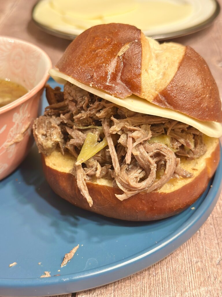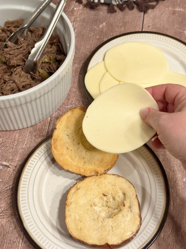 - On a warm toasted roll, lay a slice of provolone or other cheese on one side. On the other side, pile on the shredded beef mixture. Smooth both sides of the sammie together. Ladle some of the hot liquid from the pot into a small bowl for dipping the sammie if you wish. We highly recommend.