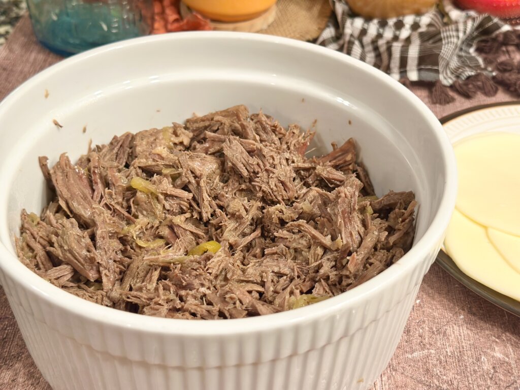 Use a large slotted spoon to scoop all the beef, pepperoncinis and onions out of the liquid. Break up the beef or shred it as you prefer. Place all this goodness into a serving bowl.