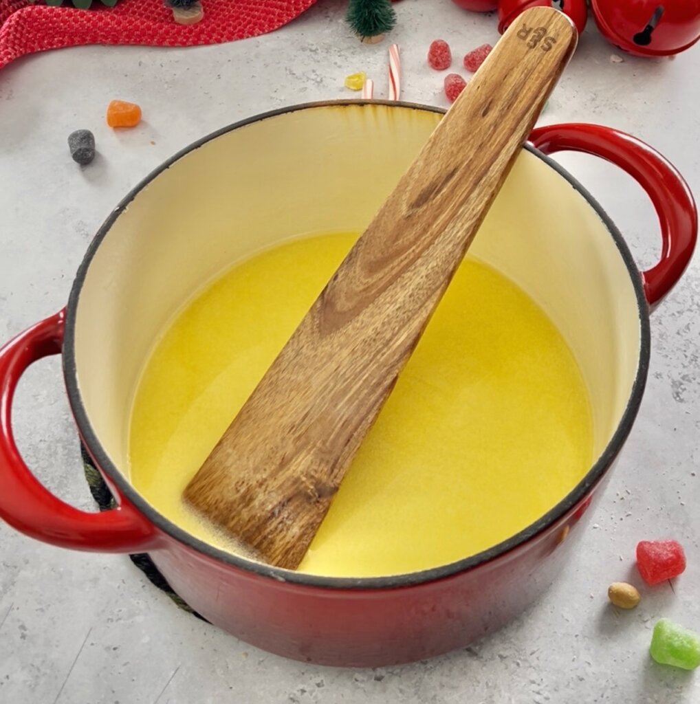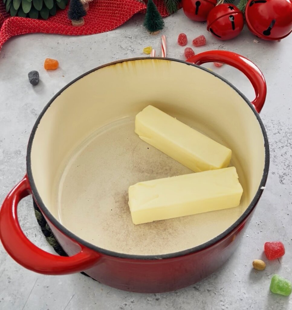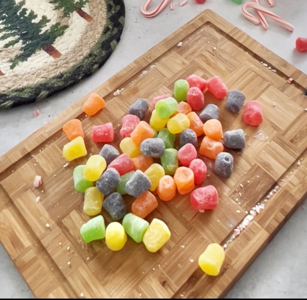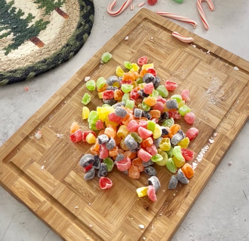 Cut up the gum drops. Our absolute favorite GUM DOPS can be ordered HERE! I’ve been ordering them every Christmas for years! Back in the day we always used red and green, but they are all spiced and we much prefer the flavors of the colored ones.