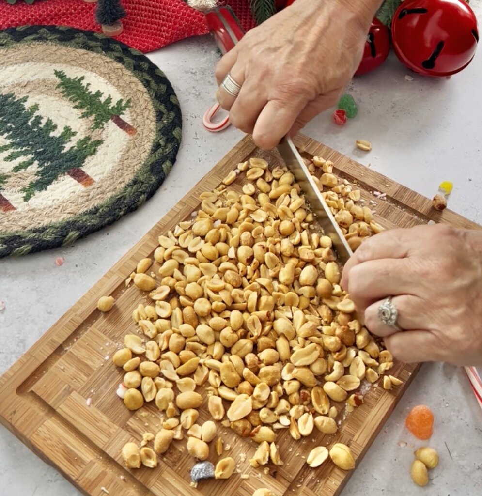 Continue prepping all the add ins that like by chopping up the peanuts. The salty crunch adds a very nice balance to the popcorn balls. If someone has a nut allergy, then skip them. BUT they also add protein, so… HEALTHY! Right?