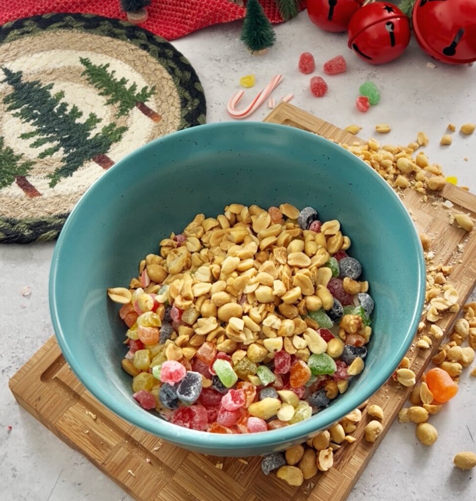 - If needed break up the candy canes by placing in a ziplock bag and hittng with a rolling pin.Roughly chop peanutsCut the gumdrops, I cup into 4ths.