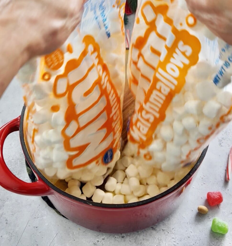 - Add the marshmallows. Stir over medium heat until the marshmallows are completely melted.Stir in green food coloring to desired color intensity.