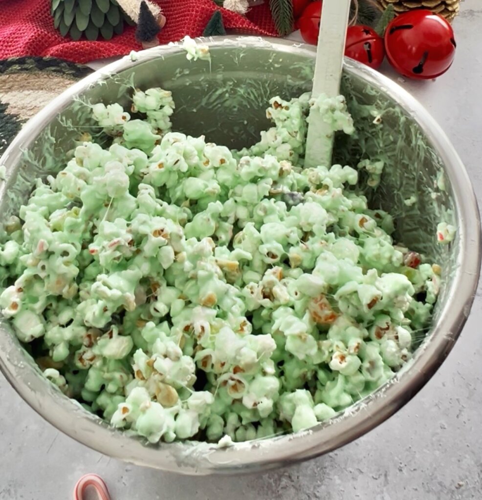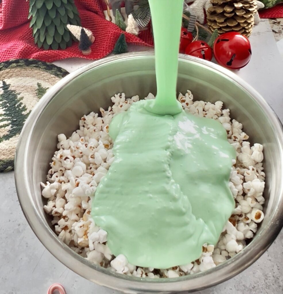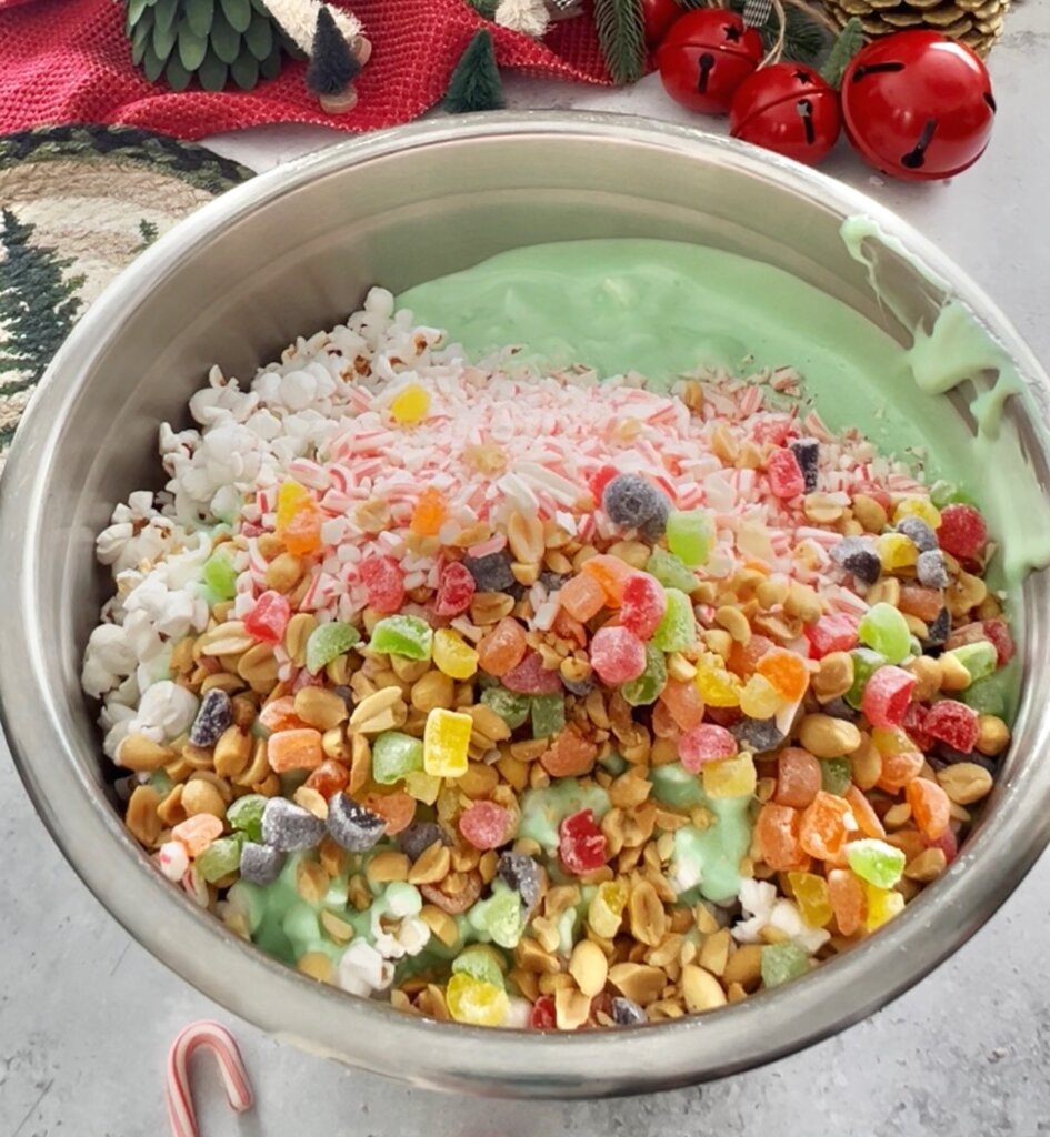Poor the marshmallow mixture over the popcorn. Add the peppermint candy, peanuts and gumdrops. Mix until all the popcorn is covered.