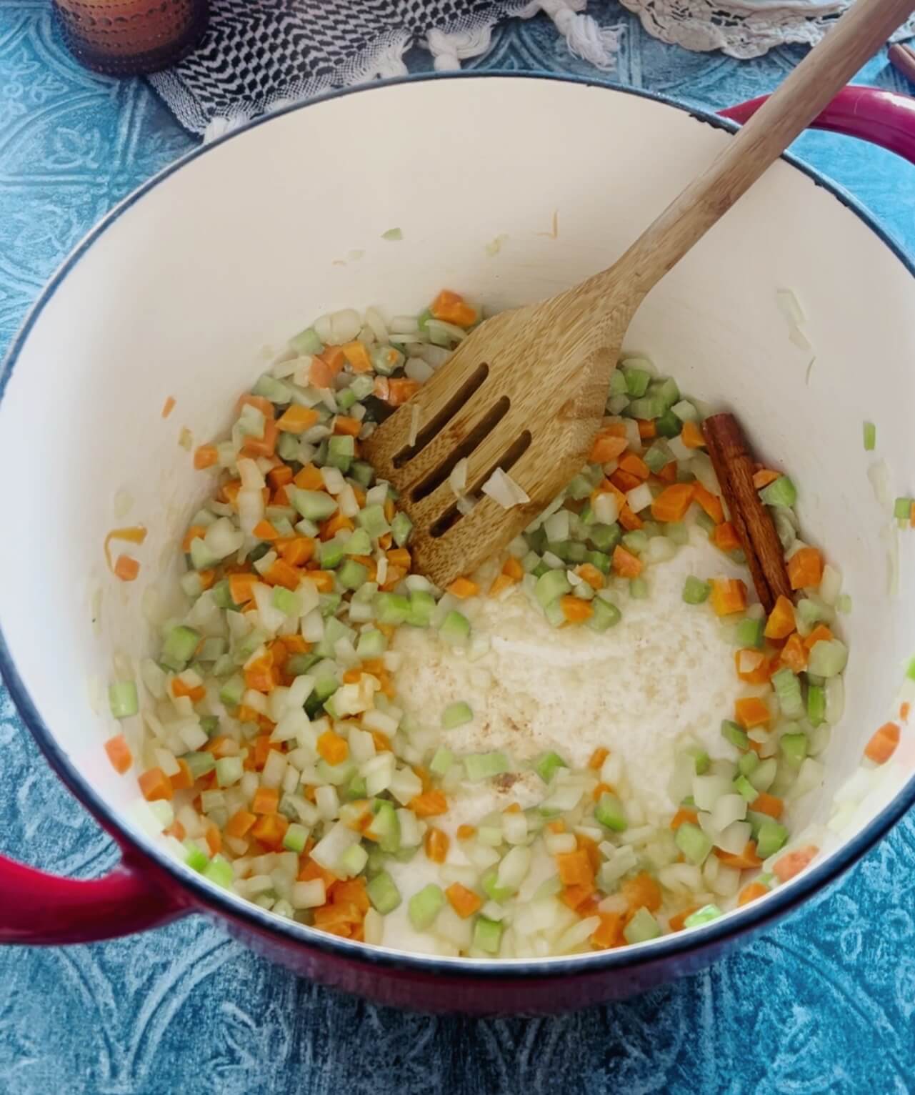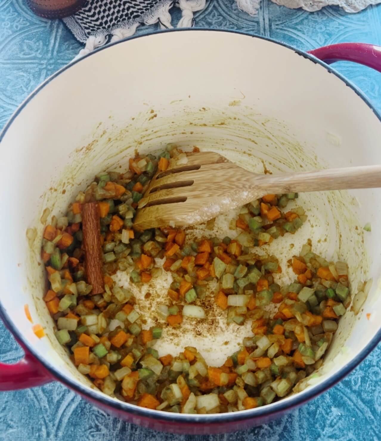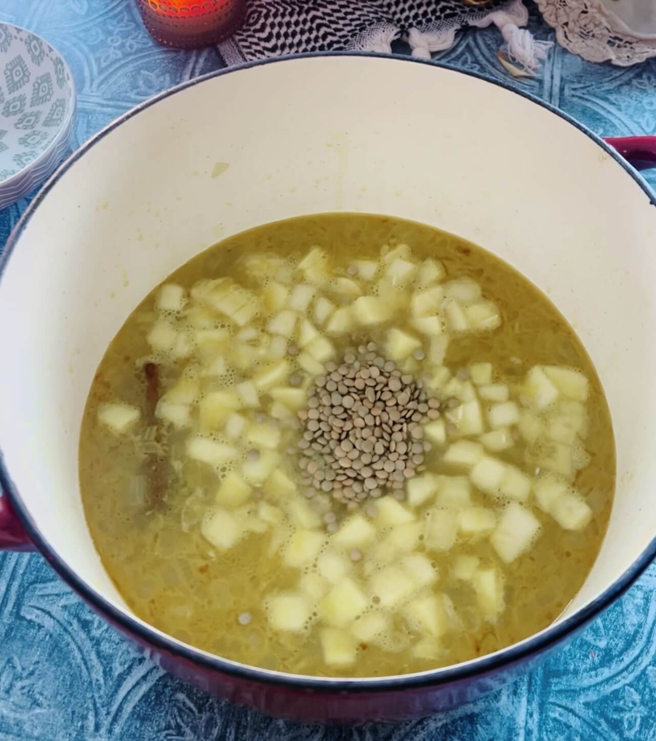 These photos show me adding the rice & lentils along with the potatoes and apples altogether. IGNORE THIS. I changed the recipe a bit because the lentils need to cook a bit longer so let’s give them a little time before adding the potatoes and apples.