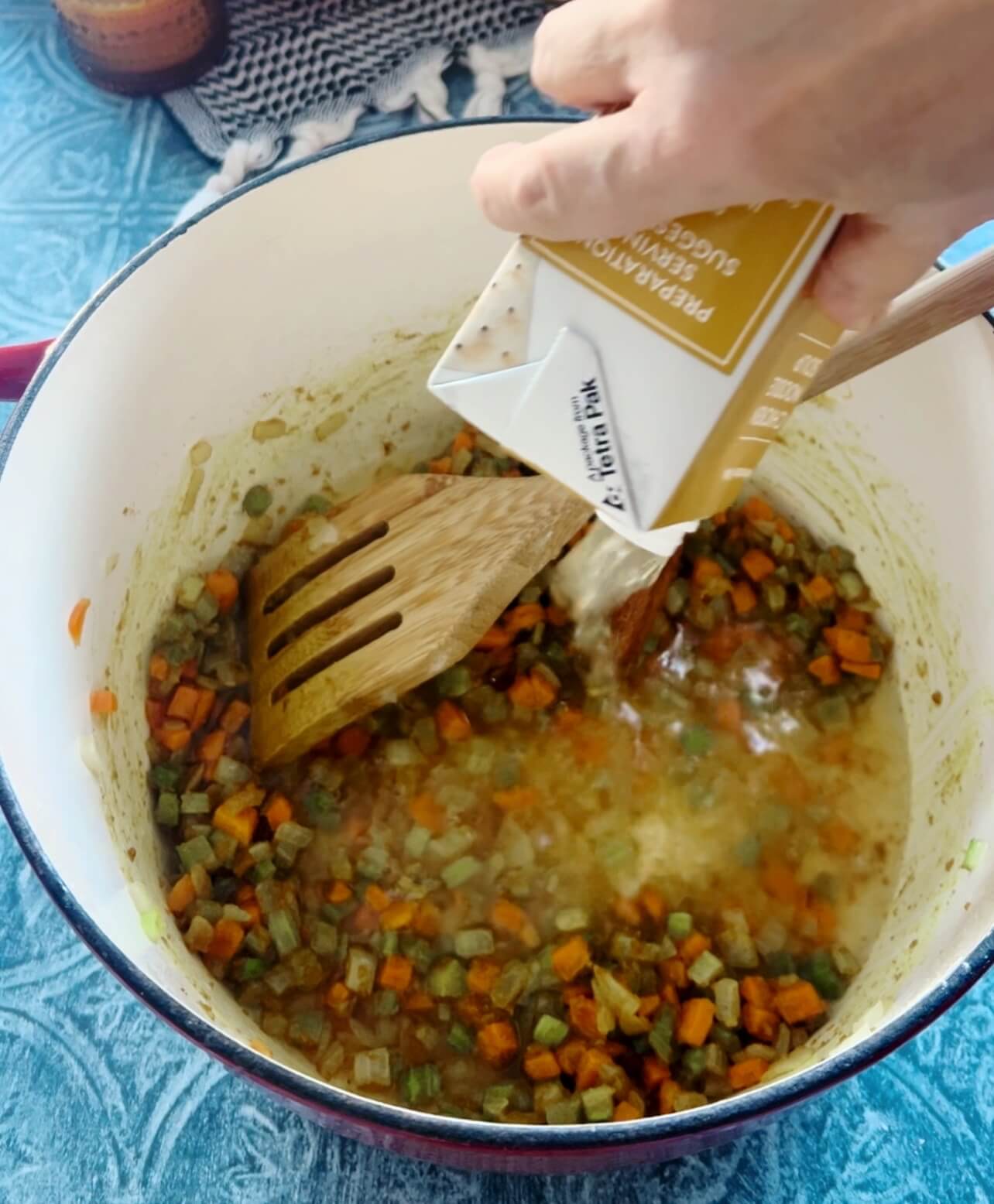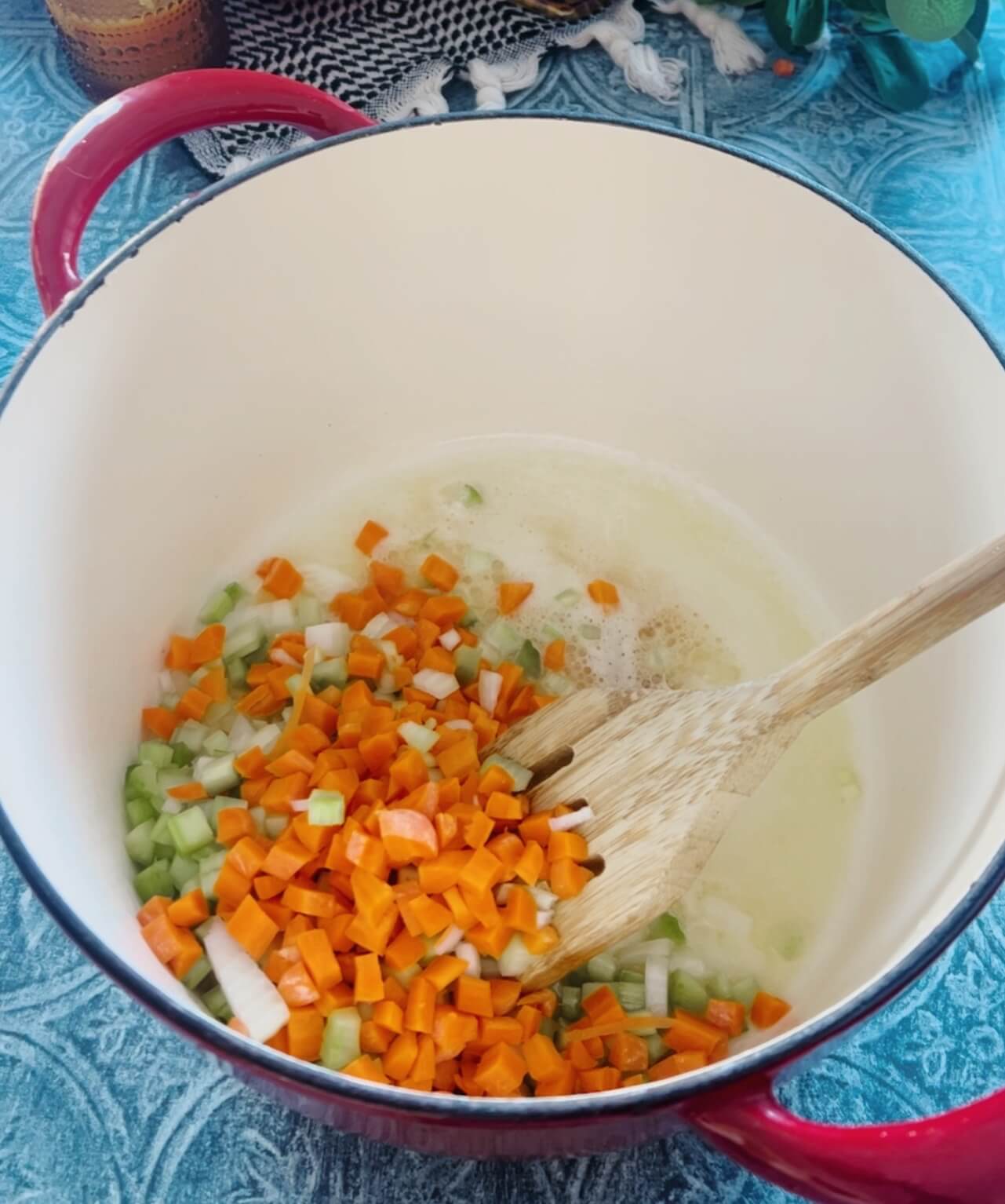 Begin by sautéing onion, celery & carrots in butter until soft.