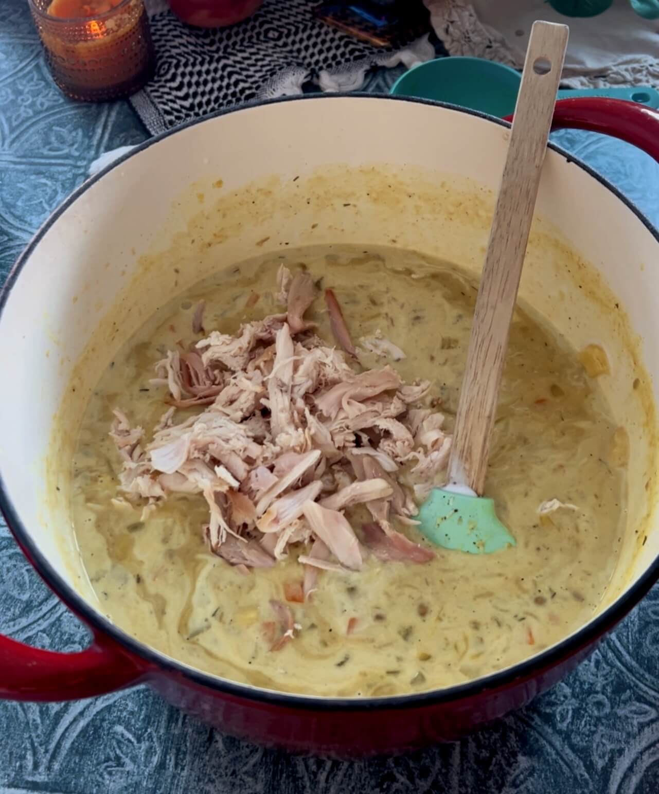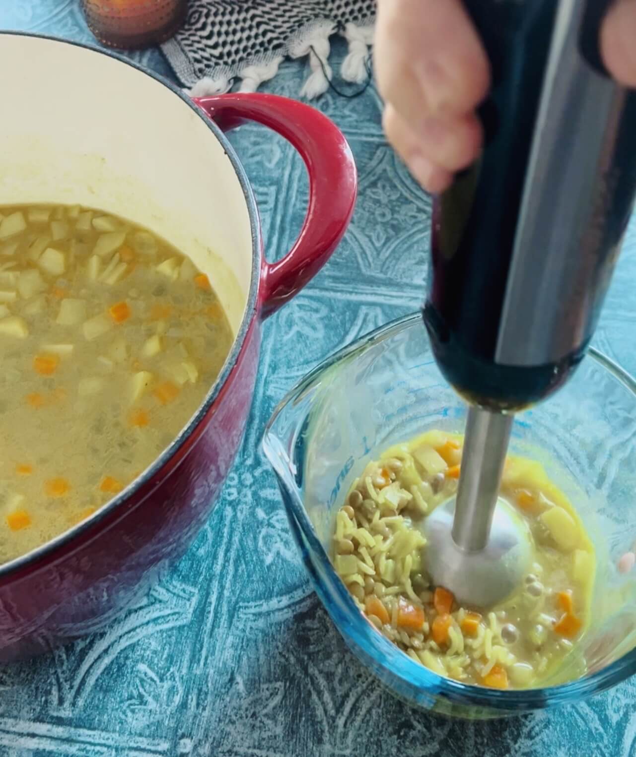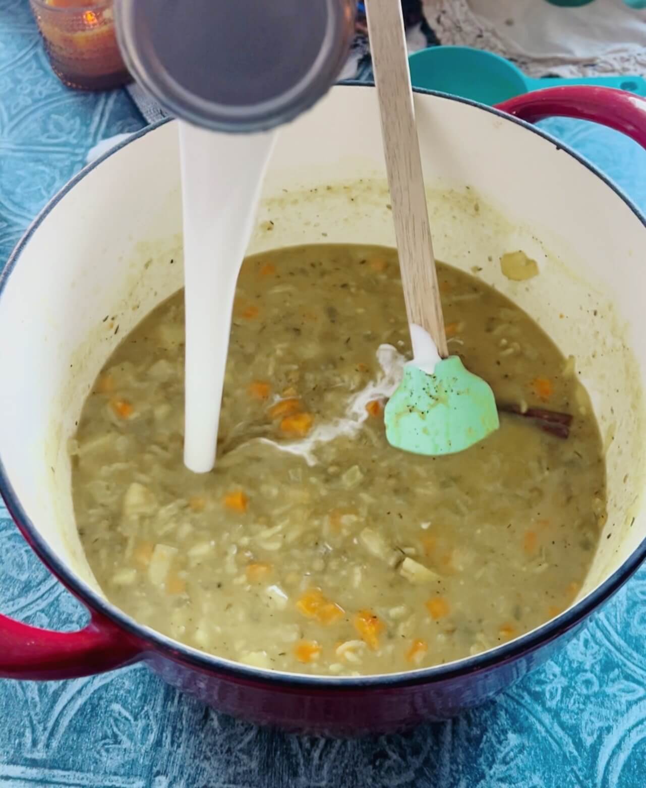 - Remove about half and blend together. Pour back into the soup.