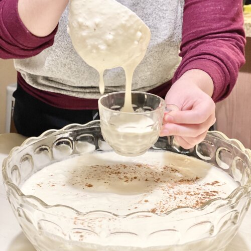 - Chill for at least 3 hours before serving. Garnish with a light sprinkle of ground nutmeg. Before serving, give it a stir and fold the settled liquid in with the foam that sits on top after chilling.