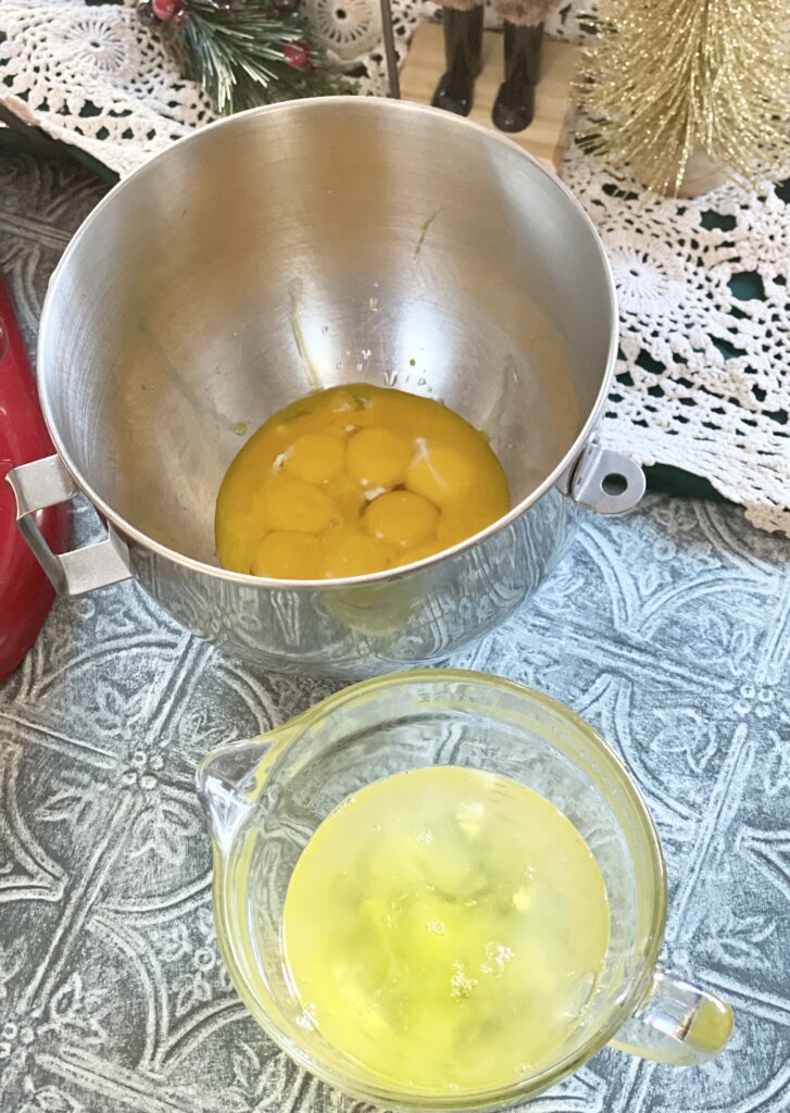 - Separate the egg yolks from the egg whites. Place the egg yolks into a mixing bowl for a stand mixer or a bowl you can use with a hand mixer. Set the egg whites aside in small bowl for later.
