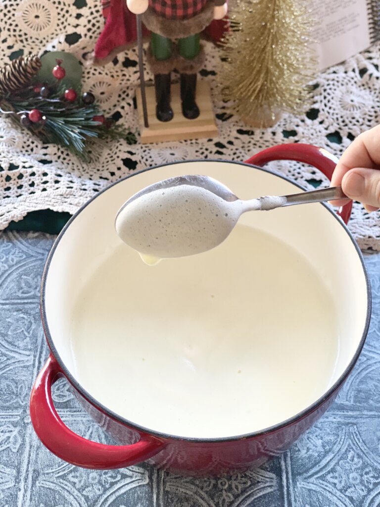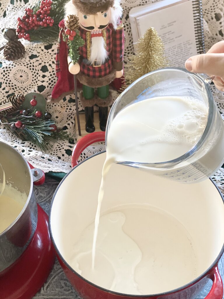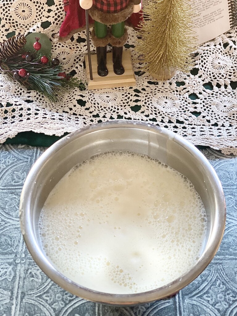 - In a medium sized pot, scald the milk over medium heat. Stir with a metal spoon and do NOT bring to a simmer or boil.