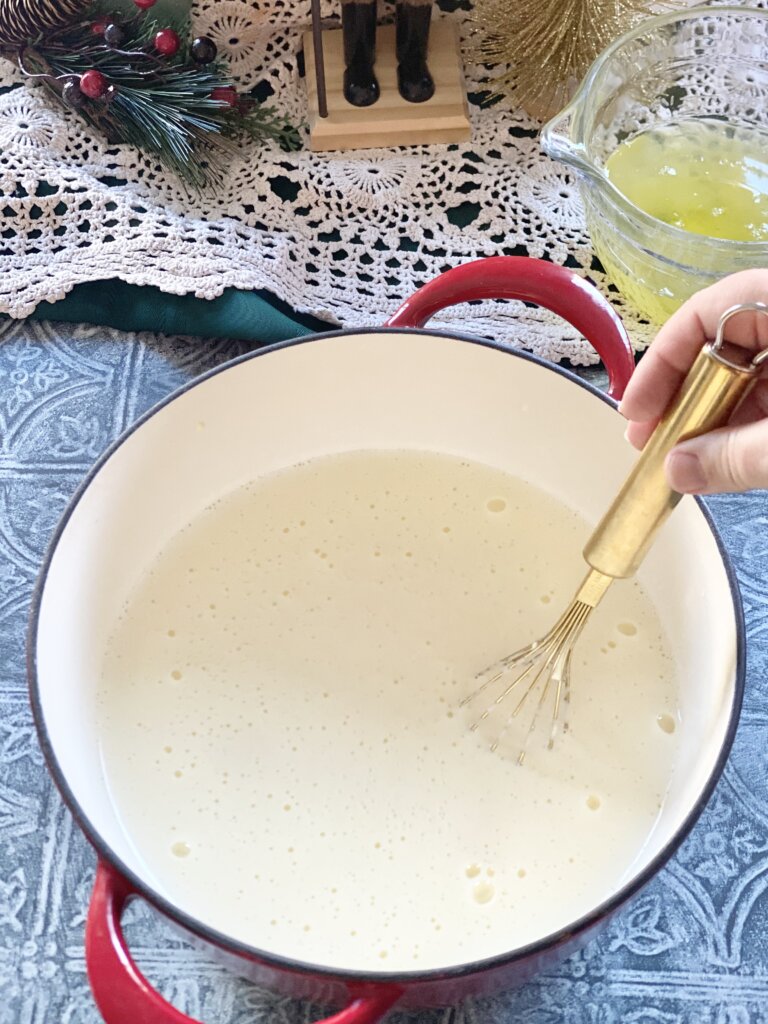 - Pour about 1 cup into the egg yolks as you are mixing. This will temper the yolks, so they don't curdle. Slowly pour the tempered yolk mixture into the pot of scalded milk over the heat. Whisk as you pour to keep the liquid moving. Let the milk and yolks cook for a few minutes, until the mixture coats the back of a metal spoon.
