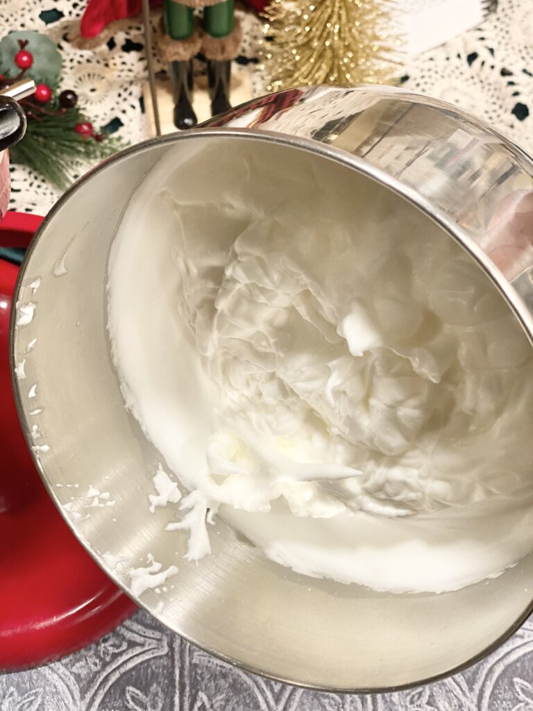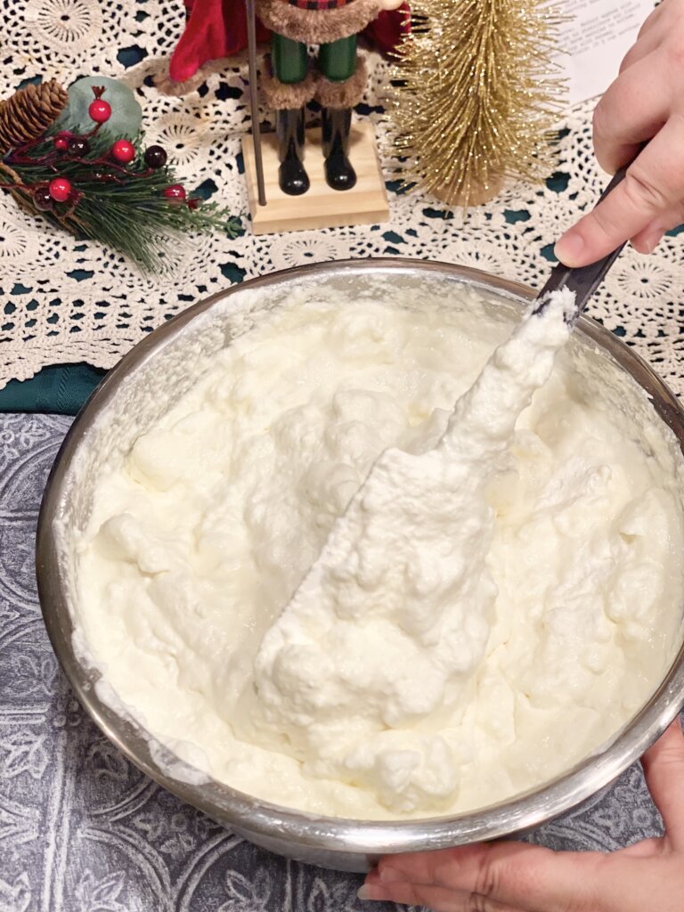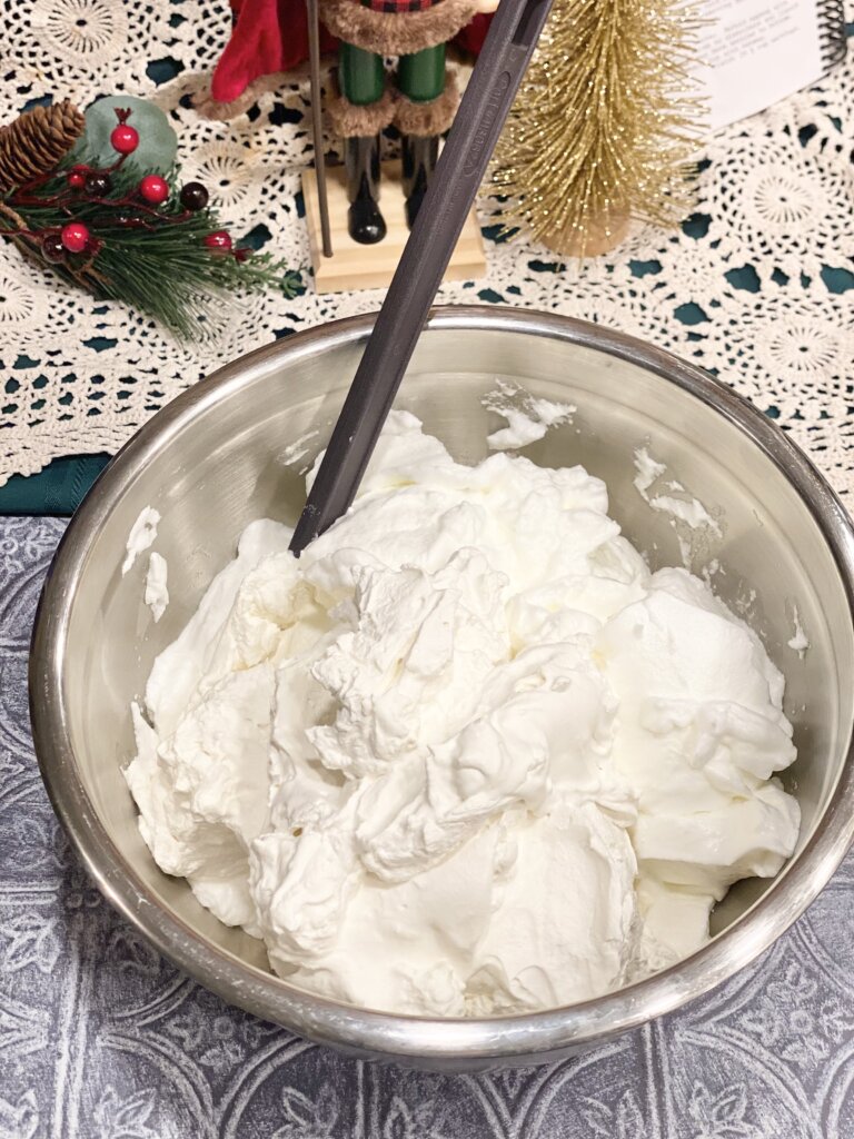 Remove the whipped egg whites to a large container or mixing bowl. Wash out the mixing bowl. Use the stand mixer to whip the cream with the vanilla extract till thick and smooth, but not stiff. Add the cream to the whipped egg whites in the large bowl.