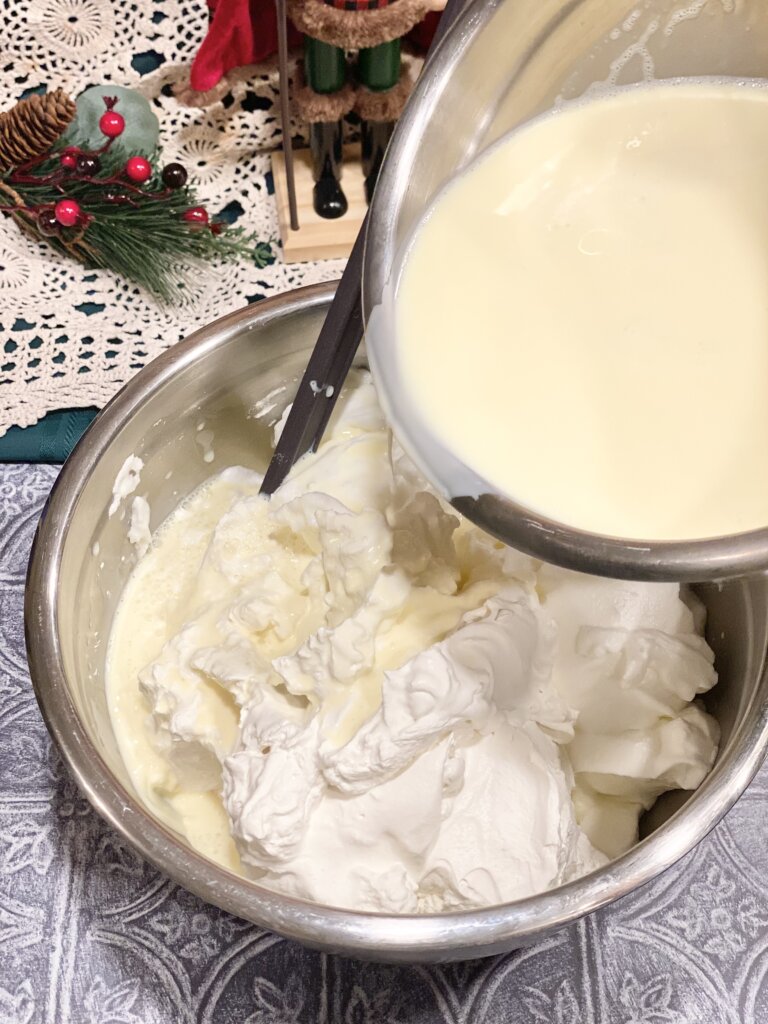 - Pour the whipped egg whites into the chilled custard. Clean out the mixing bowl. Pour in the whipping cream with vanilla to the mixing bowl, and whip till it is a soft whipped cream. Add the whipped cream to the custard and whipped egg whites. Fold all three parts together till smooth and well combined.