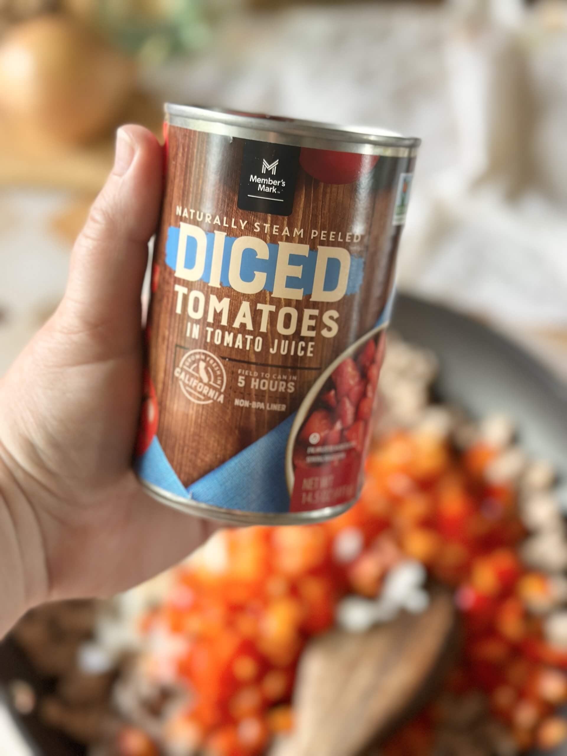 - Add in the drained, canned tomatoes and seasoning. Stir it all together over the heat till it is heated through.