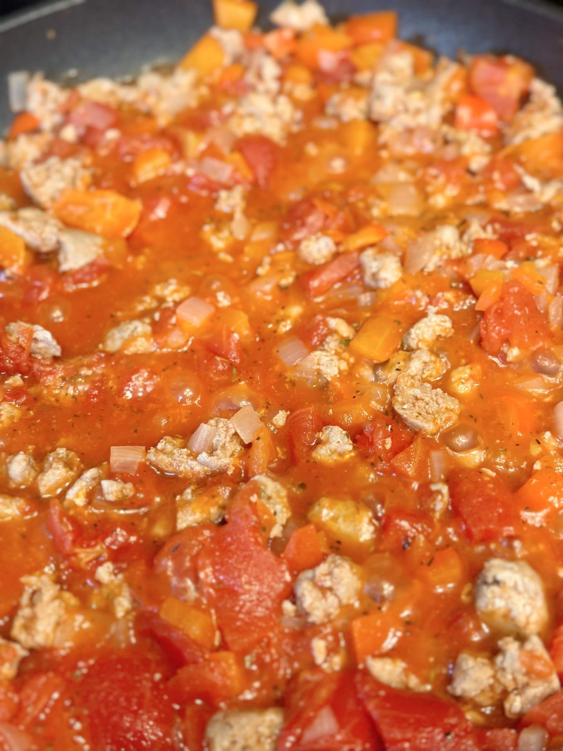 - In a medium/large skillet, spray or drizzle a little olive oil, then brown and crumble the turkey. Add in the chopped onion and chopped bell pepper when the sausage is mostly browned. Stir altogether and let the veggies cook a little in with the sausage.