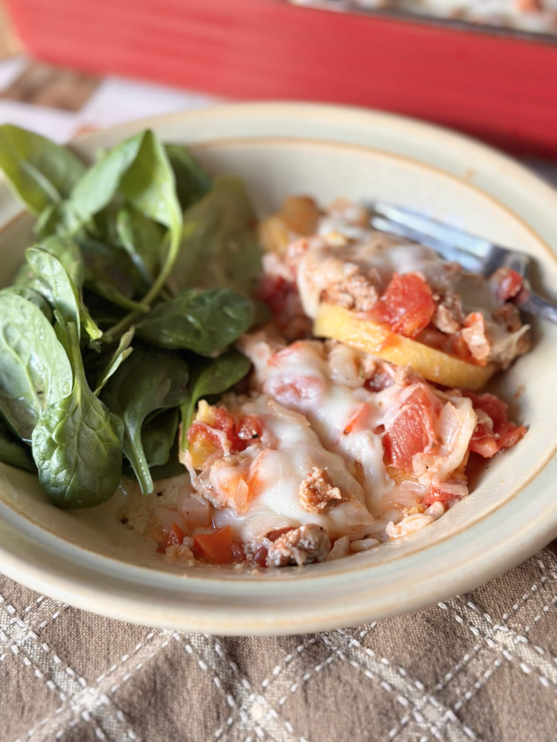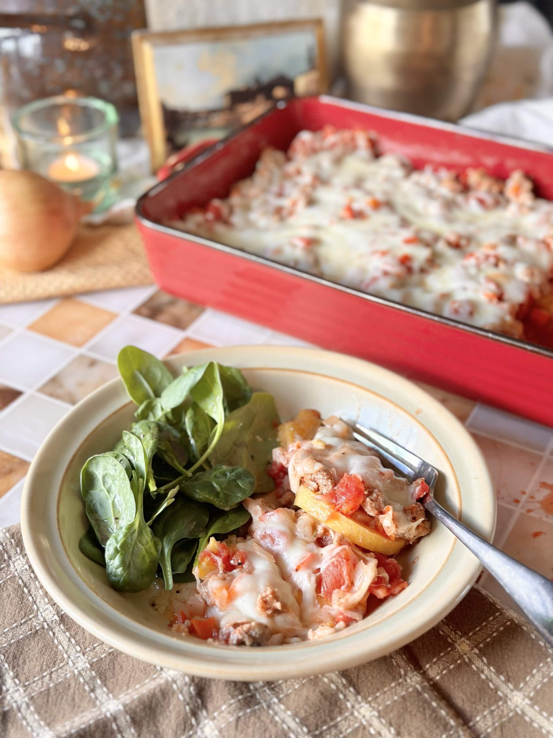 Have you ever seen prepared polenta in the store and wondered about it? “What could I make with that?” Polenta & Sausage is SO fast and easy. It tastes like a great Italian meal that is very flavorful and filling. A layer of polenta, then a turkey sausage and veggie layer and then cheese melted on top. Perfection!