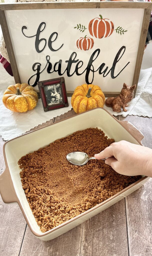 - Press the crumb mixture into 9×13 dish. Pack it in tight using the back of a metal spoon. Bake at 350℉ for 10 minutes. When finished, removed from the oven set aside to cool completely.