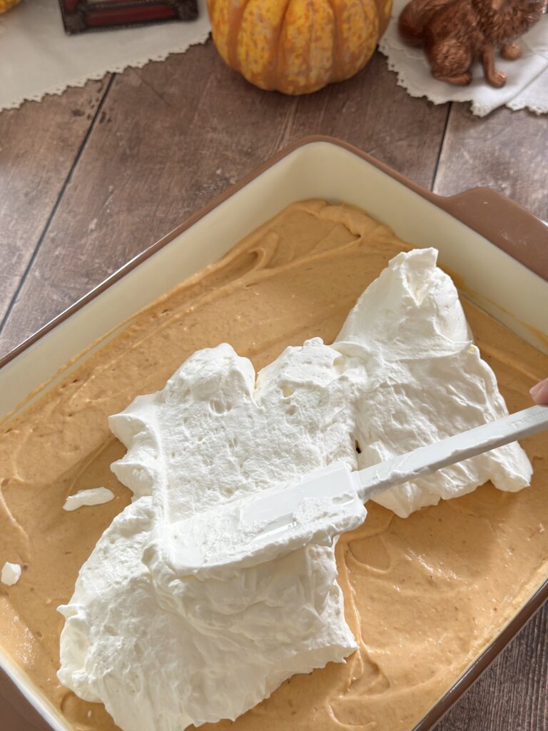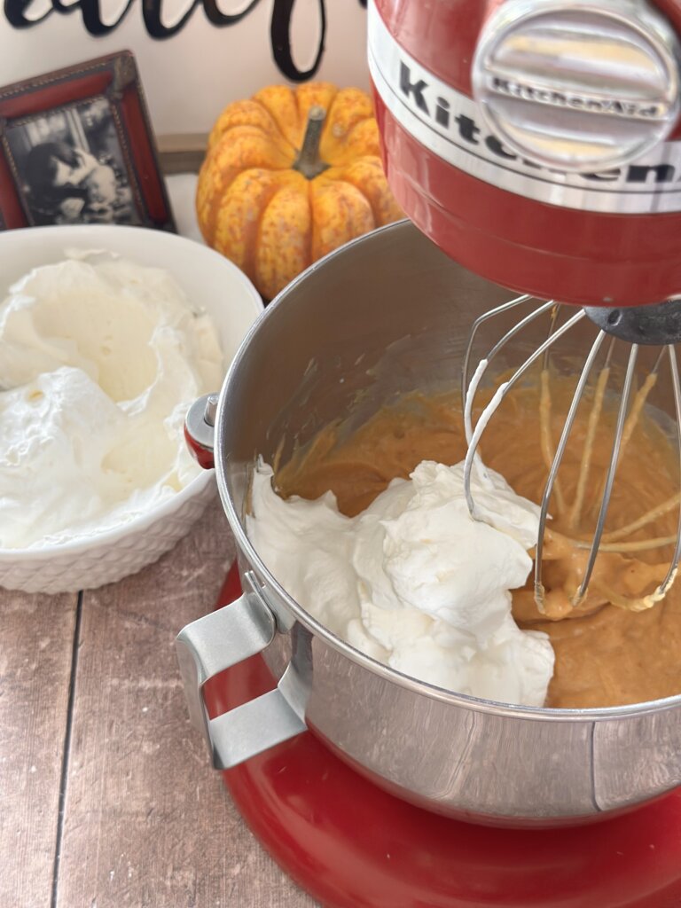 - Add in 1 cup of the previously prepared whipped cream to the pumpkin mixture and then fold together.