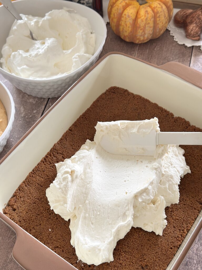 Spread the pumpkin mousse over the cheesecake layer. Next, spread the whipped cream over the pumpkin layer.