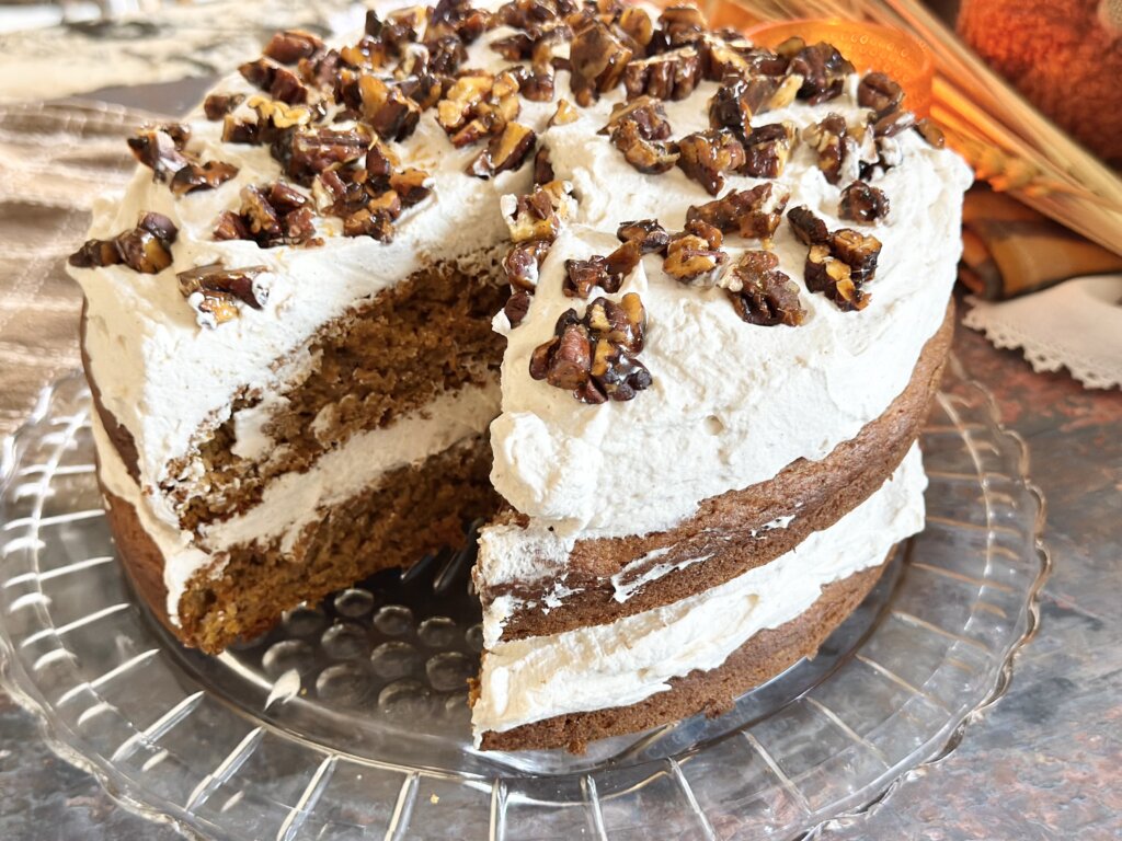 Recently I found this recipe for “Pumpkin Pecan Cake” in her book. I tried and put my own little spin on it and this might just be my new MOST FAVORITE CAKE! My husband doesn’t remember her making this, but like I said, I kinda changed it a bit. The recipe in her book said to bake in a 9×13 dish and add the pecans to the batter. Then “top with a glaze or powdered sugar.” Now do you see why I wish I could call her sometimes? I would ask her if she used preferred it with powdered sugar. Or if she did a glaze, did you use water or milk in the glaze. Did she add cinnamon to the glaze? I wish I knew these things. I miss her.