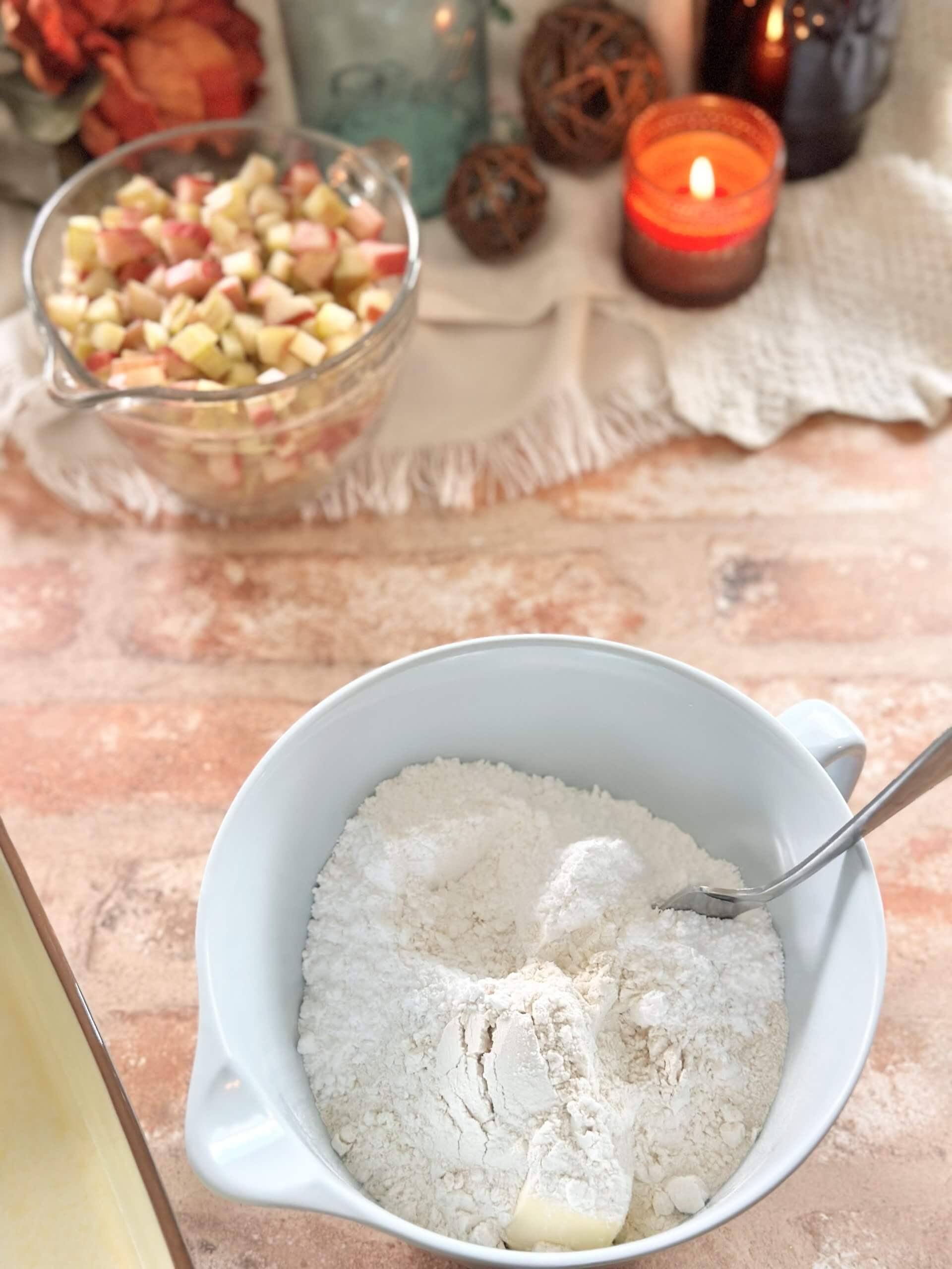 - Preheat oven to 350°. Measure the butter, flour and powdered sugar into a medium sized bowl. Use a fork or pastry blender to break up the butter and work it into the dry ingredients until it is well mixed.