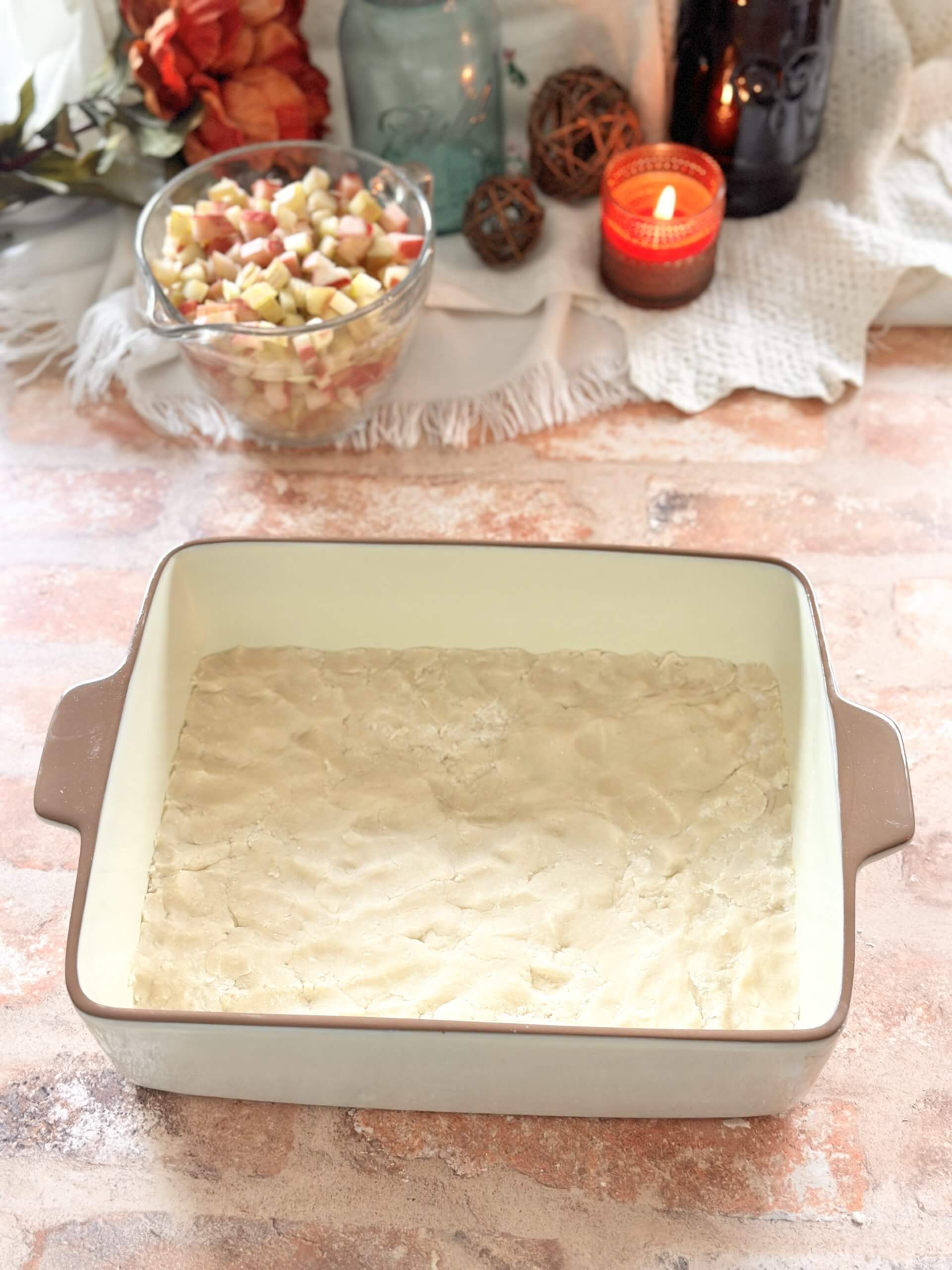 - Spray a 9 x 13 baking dish with oil or rub it lightly with butter. Press the dough into the dish. I use my hands because they are the best tool I have. Push it all into the corners and press and smoosh till it is even and smooth.
