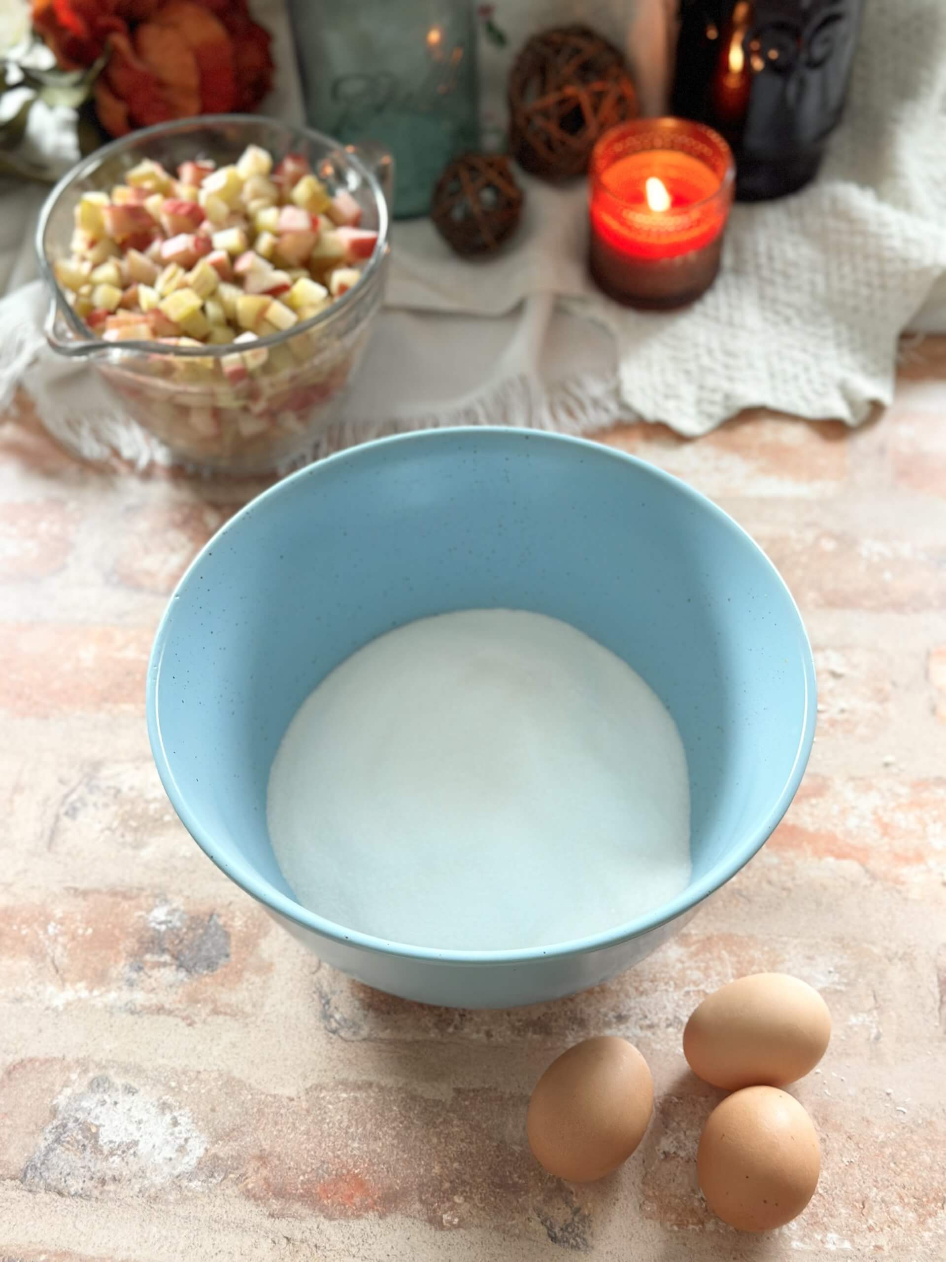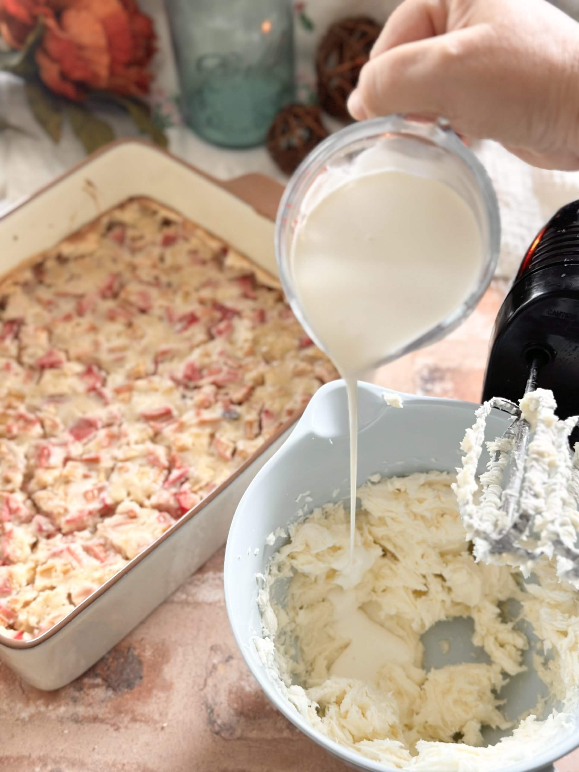 - Use a whisk to blend the sugar, flour and nutmeg together. Whisk in the eggs and cream. Next, fold in the chopped rhubarb.