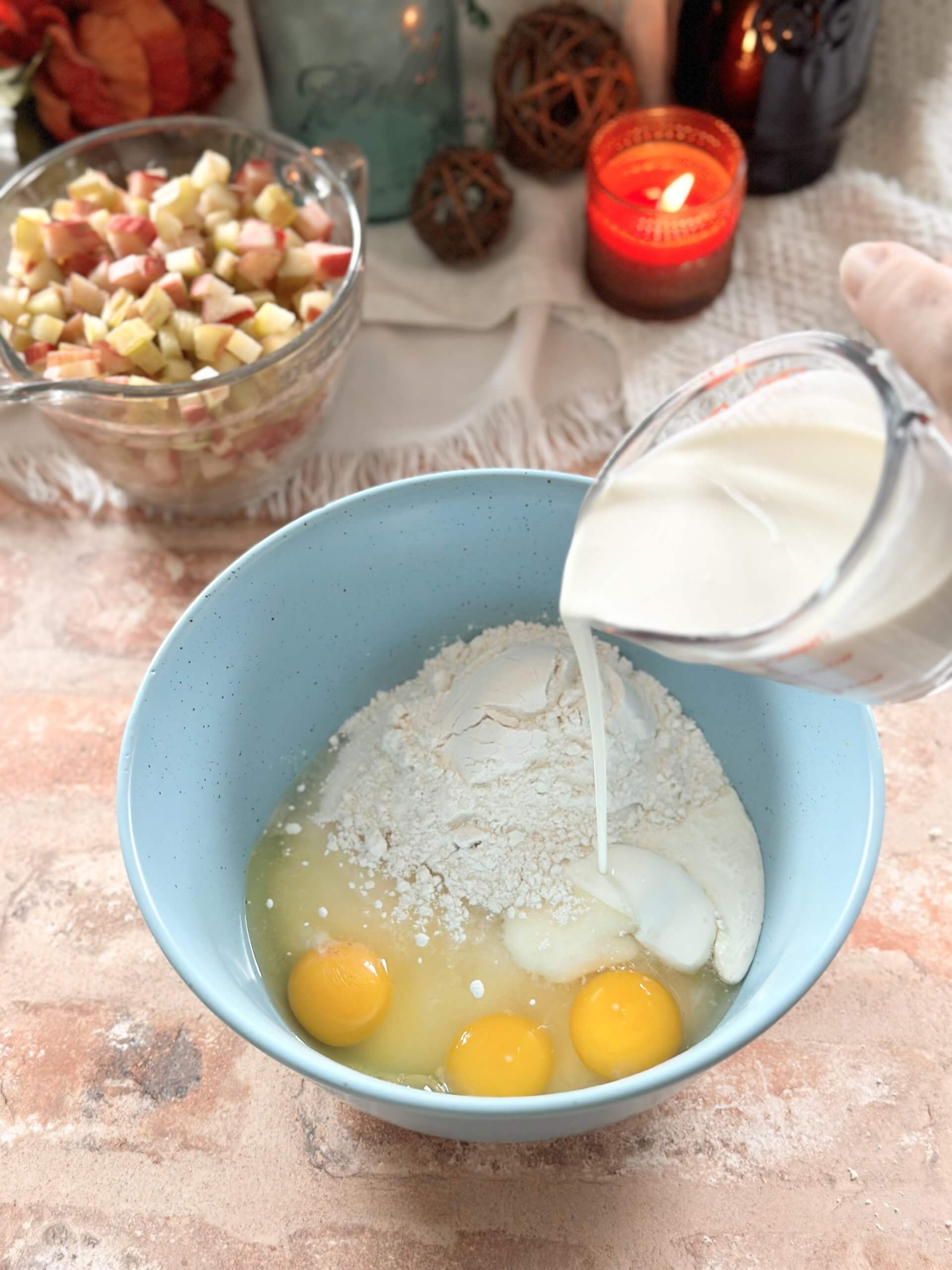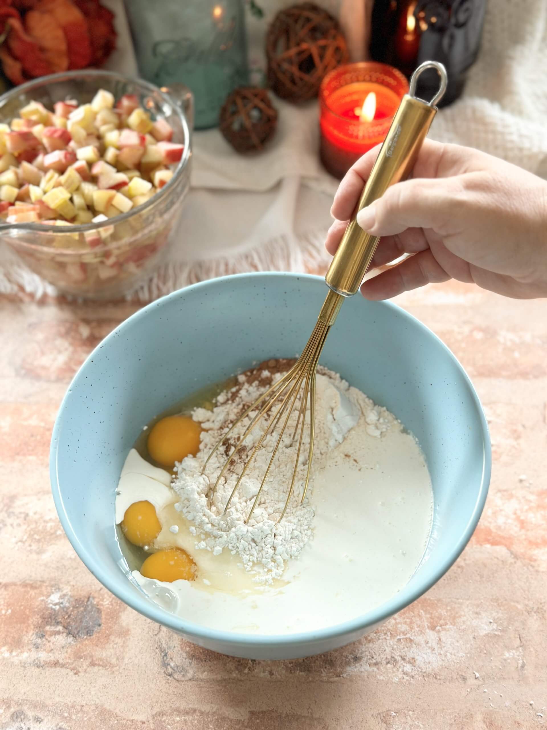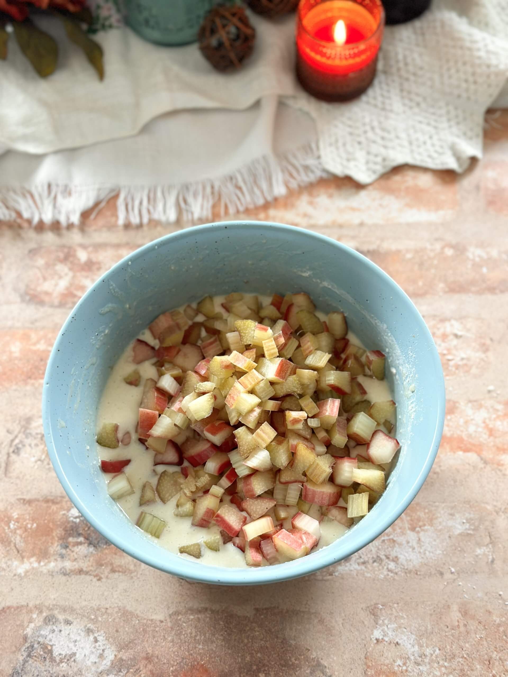 Whisk all the ingredients together till smooth, then fold in the chopped rhubarb.