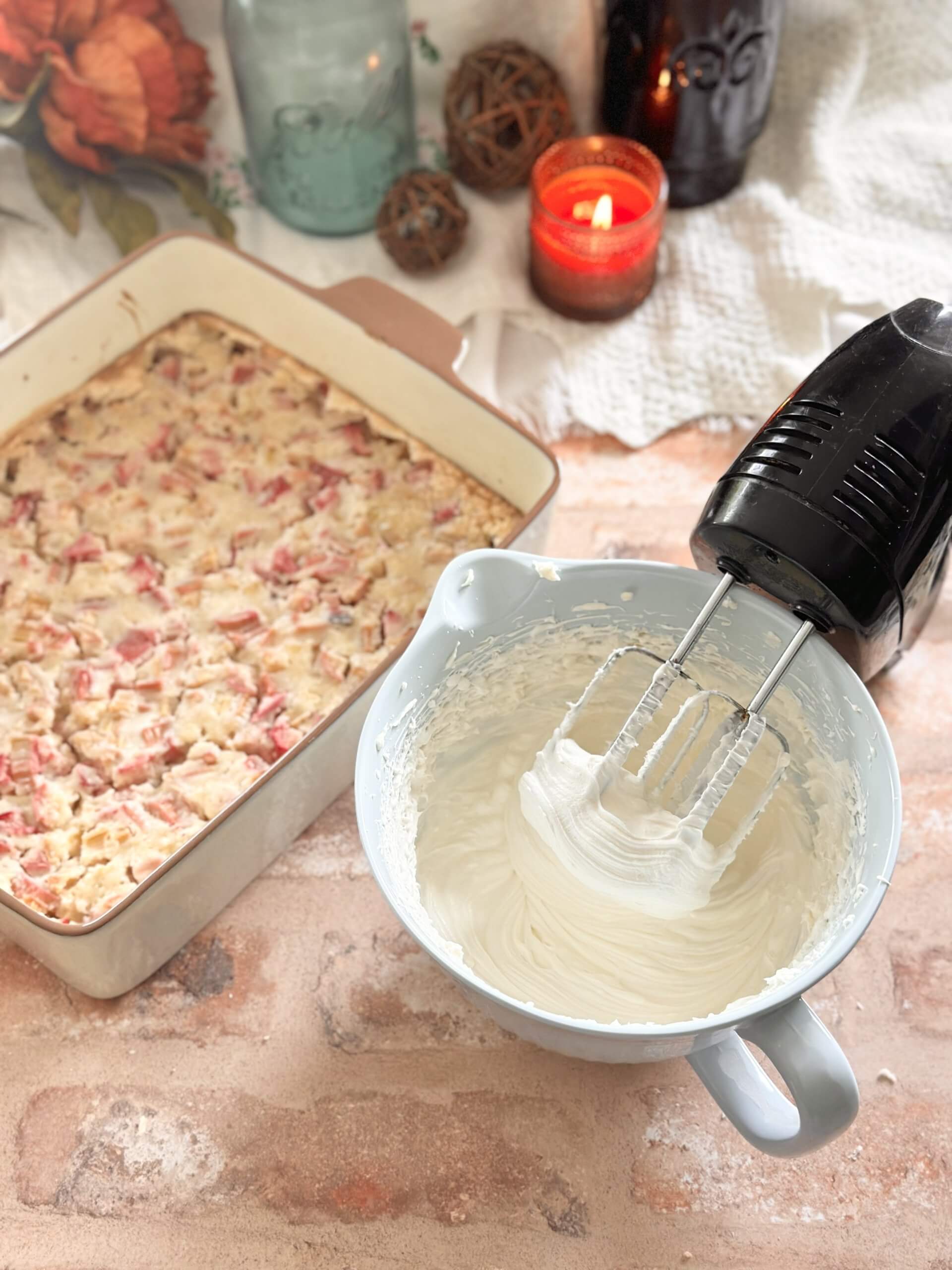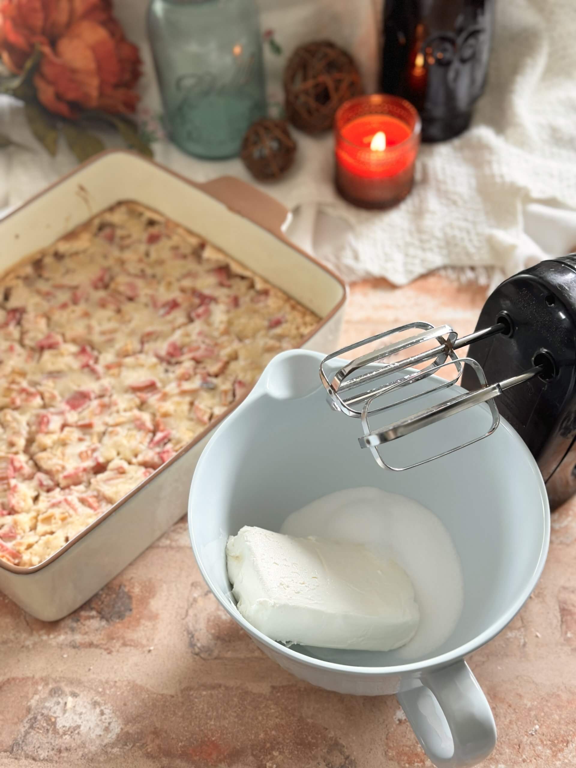 While the crust is baking get started on the custard. Chop the rhubarb and set aside. Measure all the ingredients into a medium sized mixing bowl.