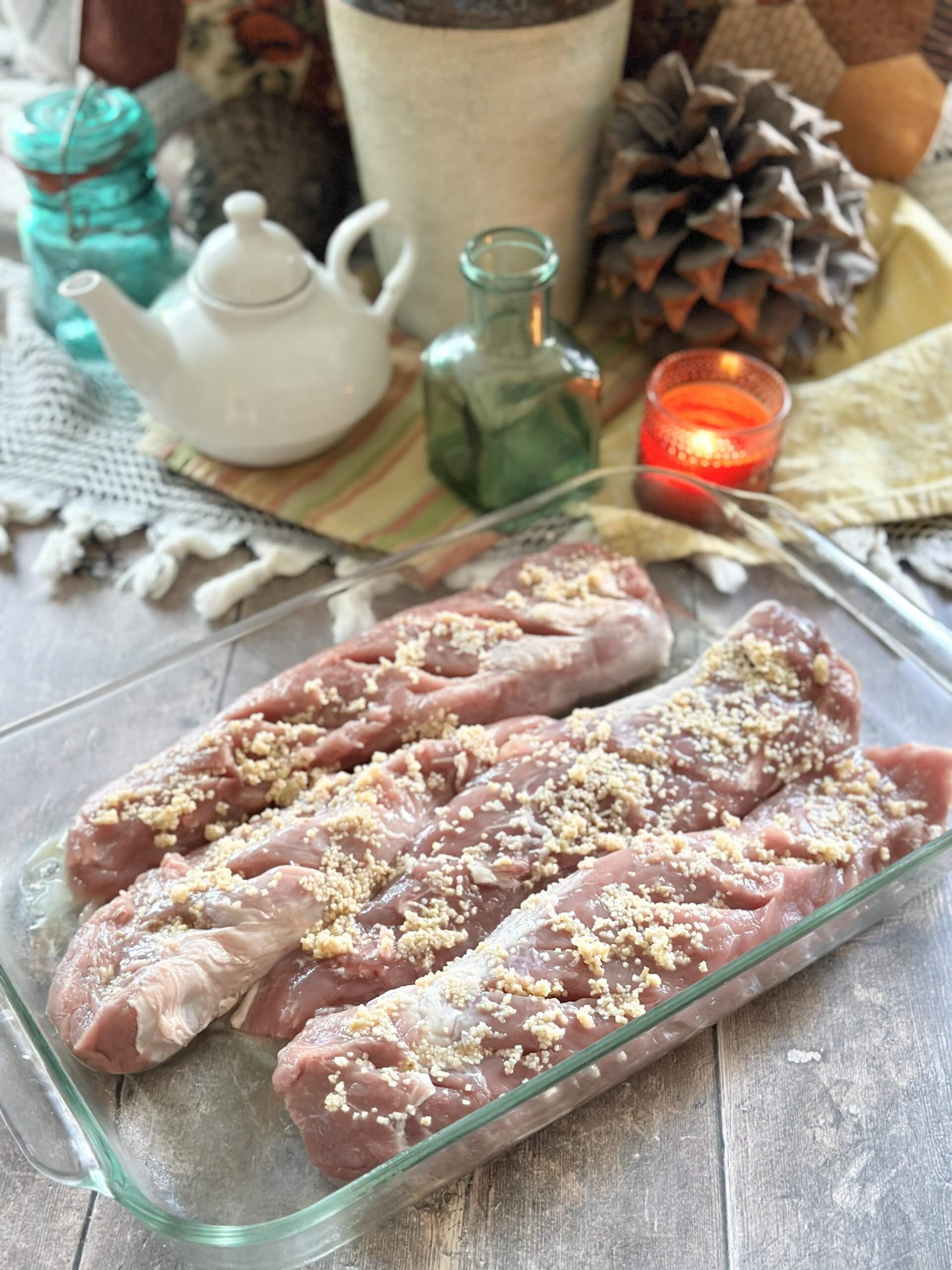 Preheat the oven to 350 degrees. Rinse and pat dry the pork after removing them from the package. Place the roasts in 9×13 baking dish. For context, the baking dish I am using here is a size 11×17. I am using a bigger than normal one so I can fit 4.