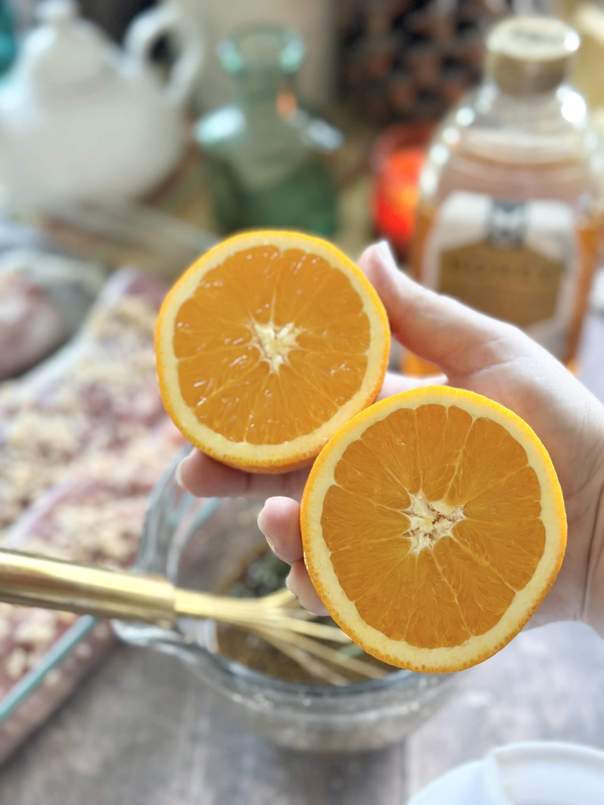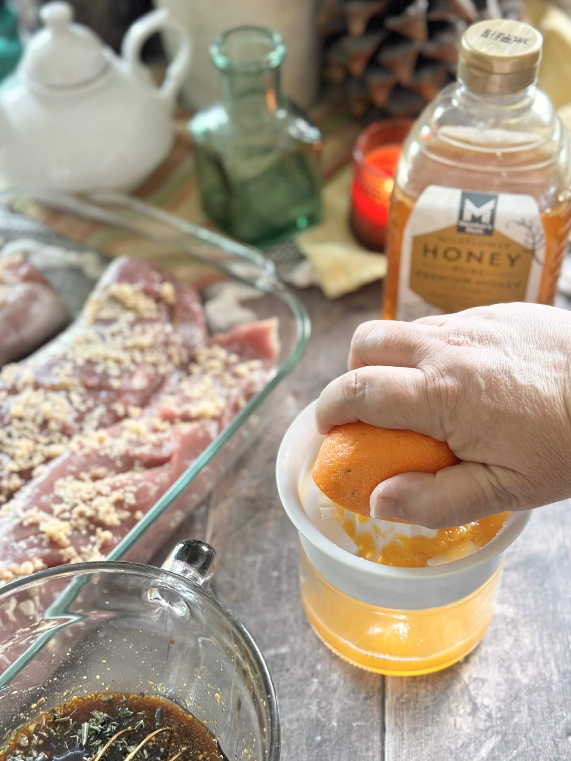 In a small mixing bowl whisk all the marinade ingredients together, except the olive oil. I have always used a freshly squeezed orange for the juice. I’ve never used bottled or concentrate. Although, I think bottles would work fine in a pinch.