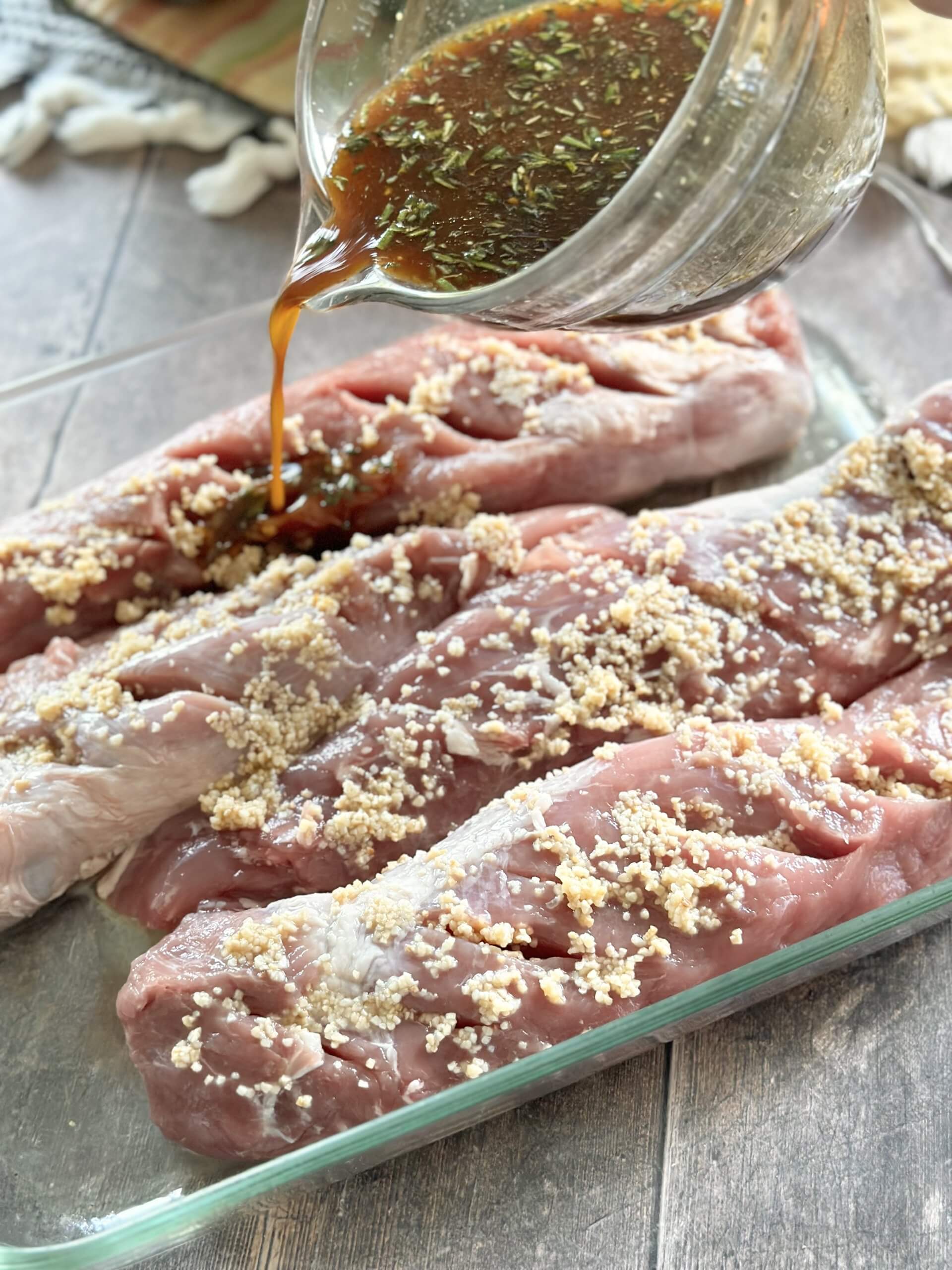 - Slowly pour the marinade over the meat. Don't pour so fast that the garlic slides off. Pepper the tops of the meat.