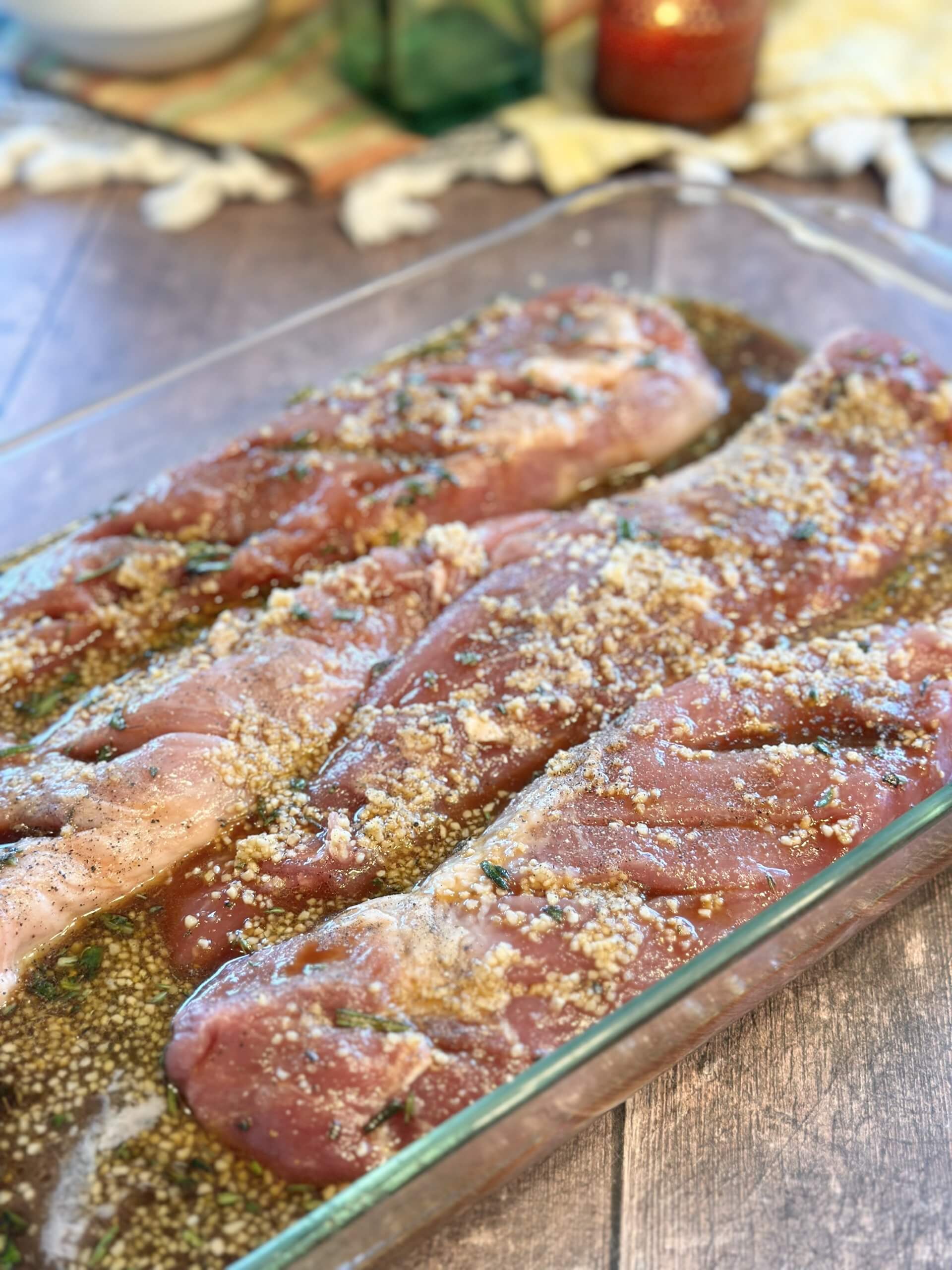 Remove from the oven and let it REST for 10 minutes to complete the cooking process. Remove the pork loins from the dish to a cutting board. Use a sharp carving knife to slice the roast into 1-inch thick slices. Leave on the board for dishing up, or place on a platter for the table. I like to put some of the liquid in a little pitcher or bowl with ladle next to the meat so people can drizzle it over their meat for more flavor.