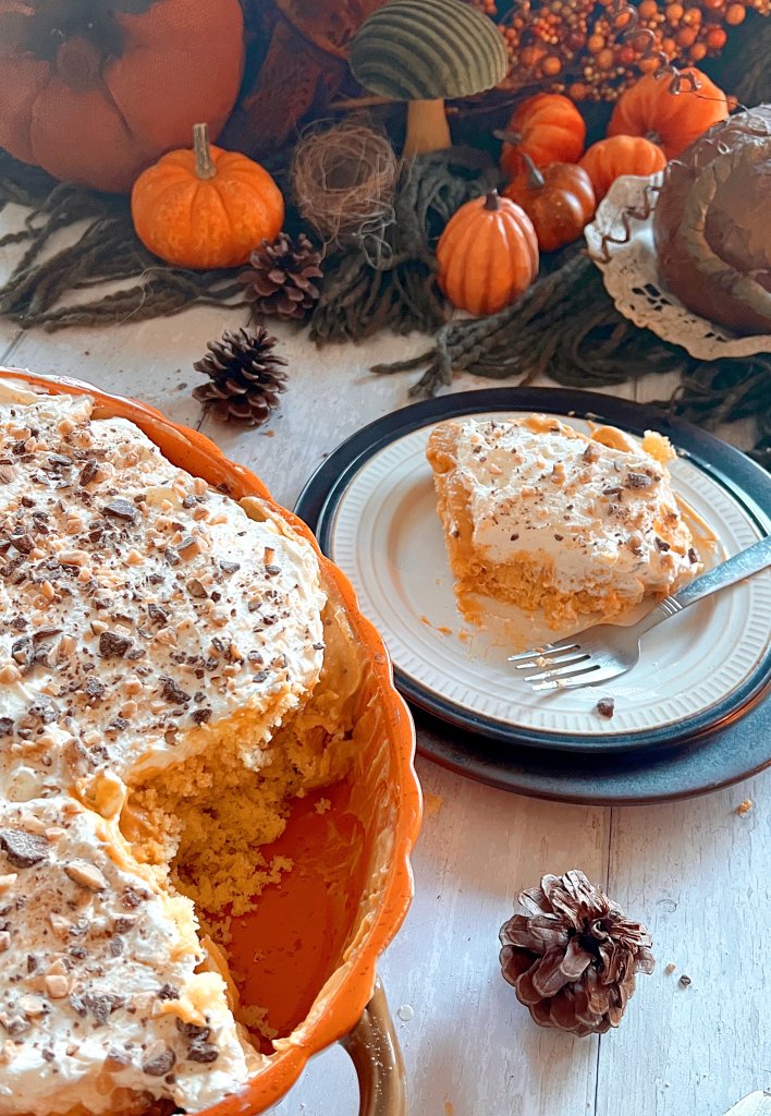 Pumpkin Cream Poke Cake is a light and fluffy cake that is filled with pumpkin mousse and topped with whipped cream. So. Good.