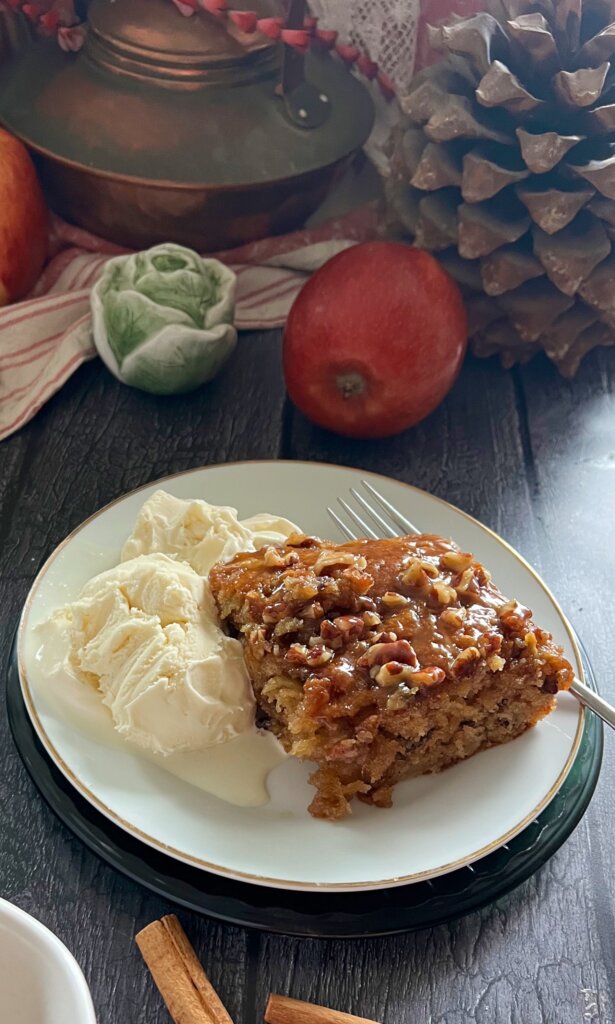 Apple Caramel Pecan Cake is really special. No need for frosting. It is topped with a thick caramel that seeps into the cake and some chopped pecans. Just make sure to have some ice cream for the side.