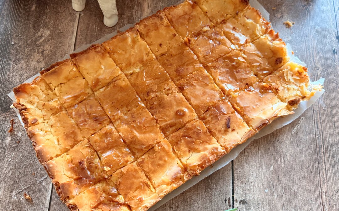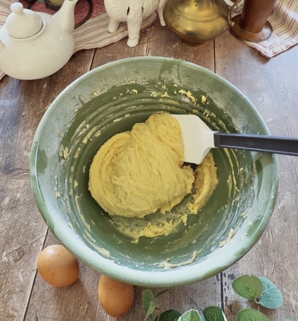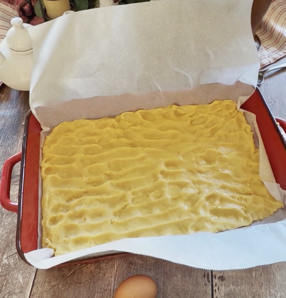 The crust was originally a sweet yeast dough but now is made so simple by using a yellow cake with butter and eggs.