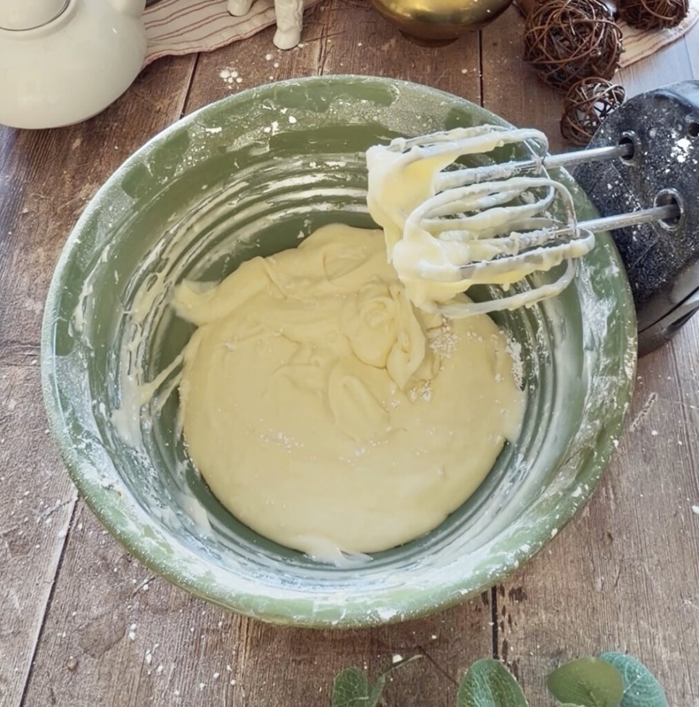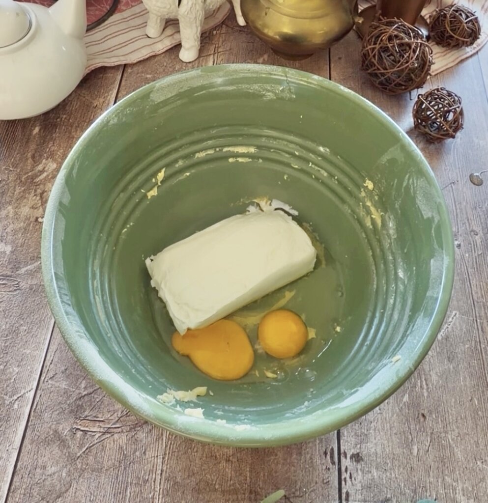 - In the same add the cream cheese. NOTE: If necessary, zap in the microwave for 20-30 seconds so that it's very soft. Add remaining 2 eggs, the powdered sugar and vanilla. Whip on medium until smooth, about 45 seconds.