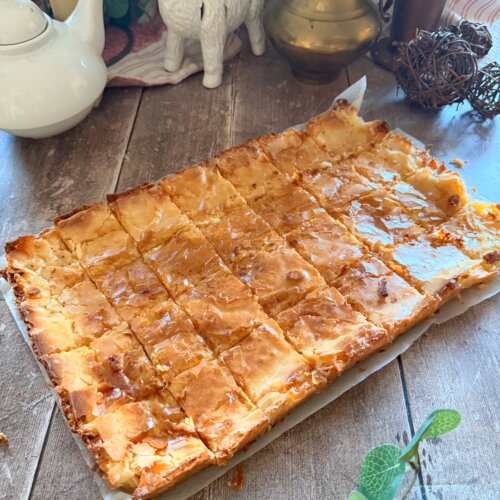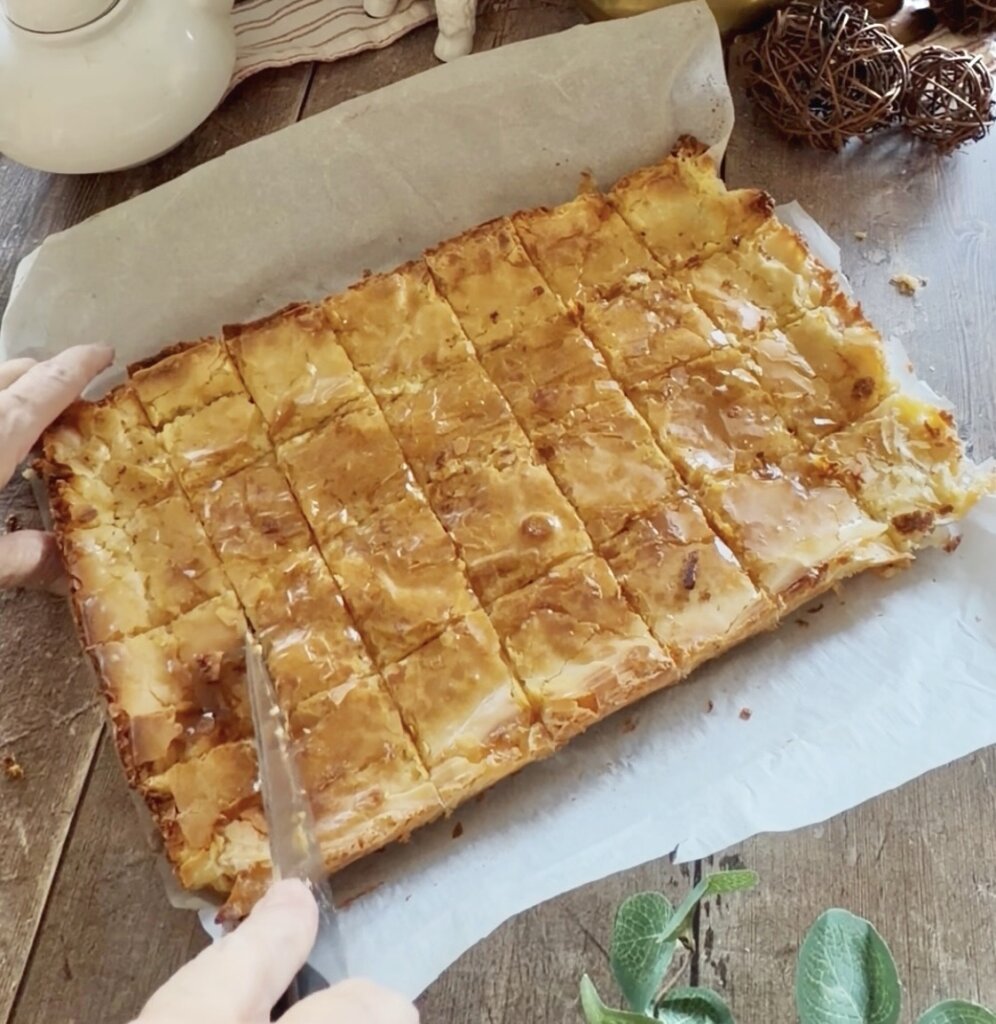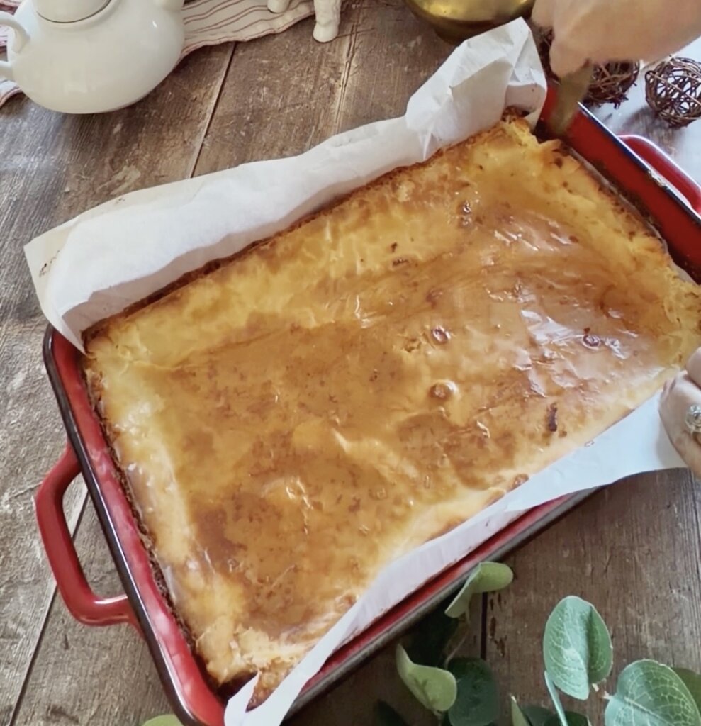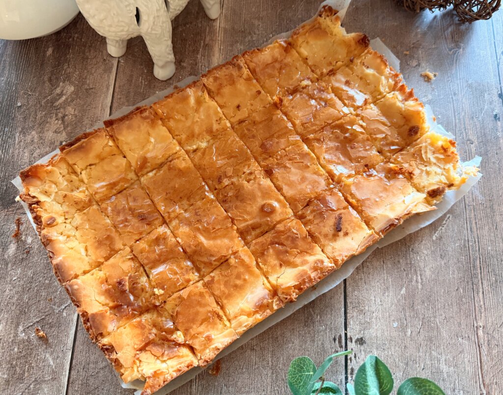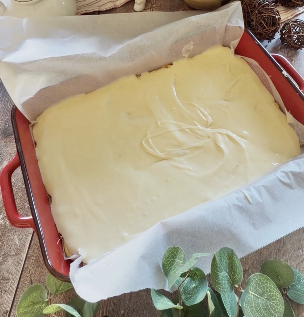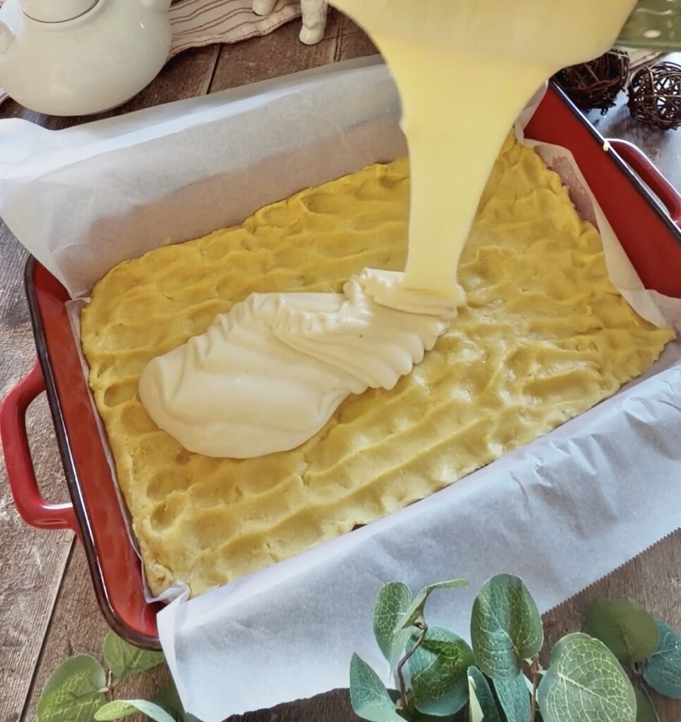 - Pour over the prepared dough. Bake in center of oven for 35-40 minutes.Remove from oven and cool on rack for 2-3 hours.Use a thin knife to loosen the edges and lift out using the parchment paper.Cut into 24 pieces.