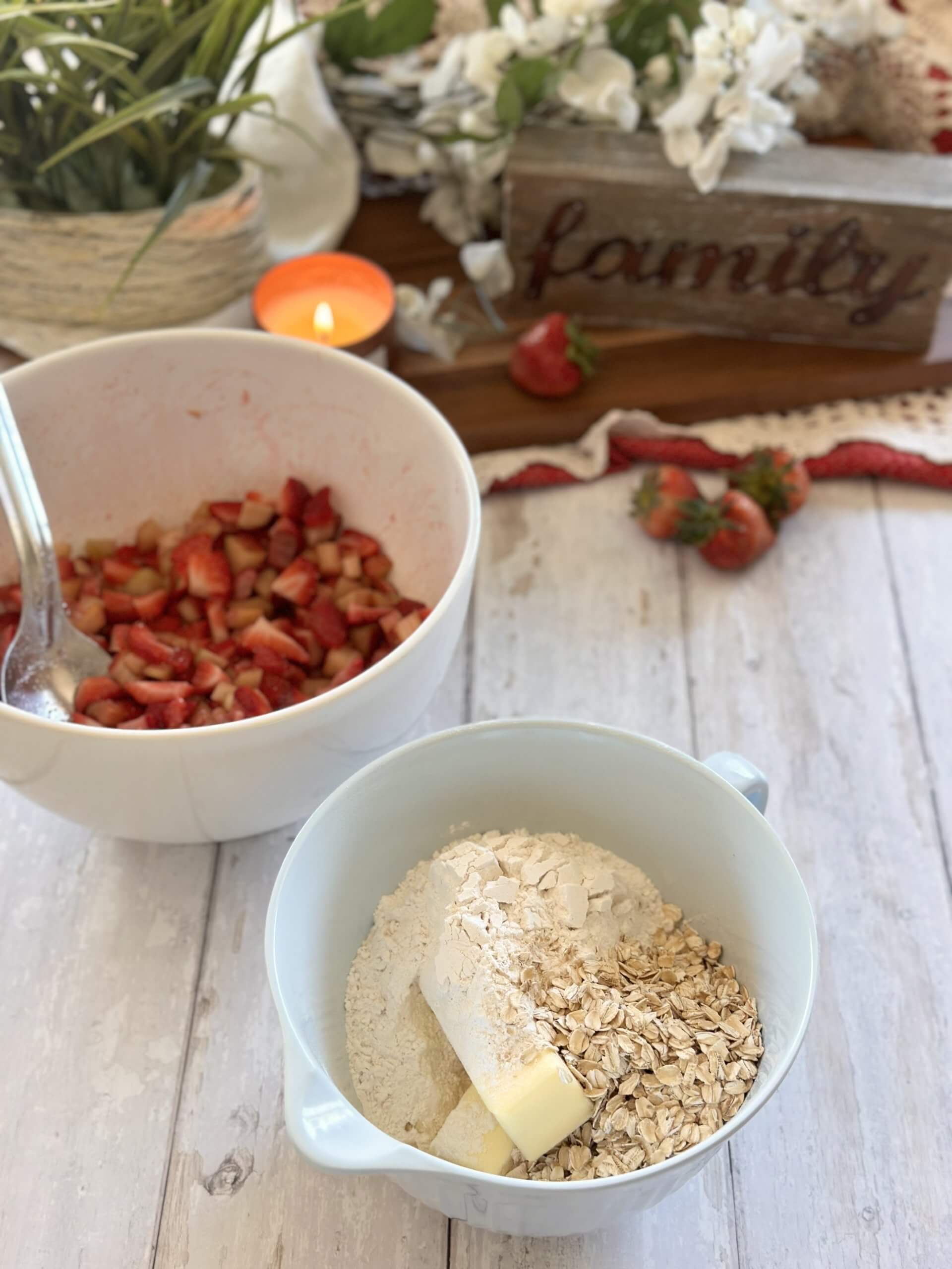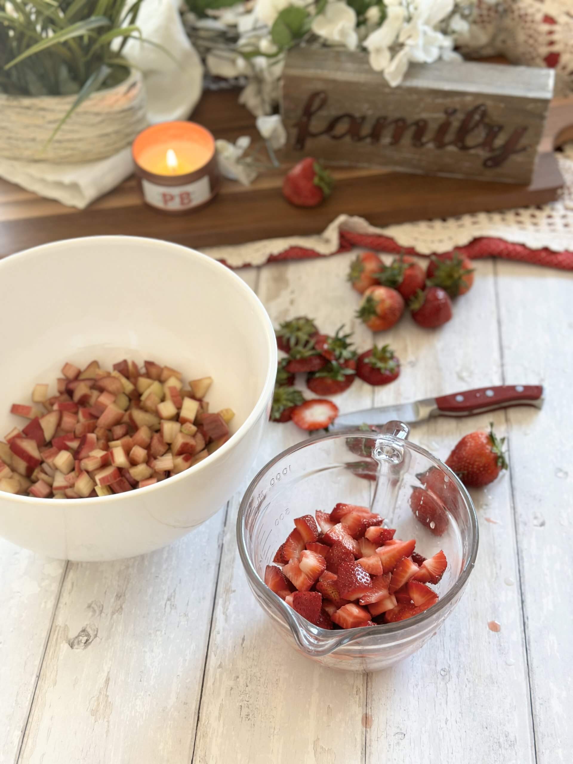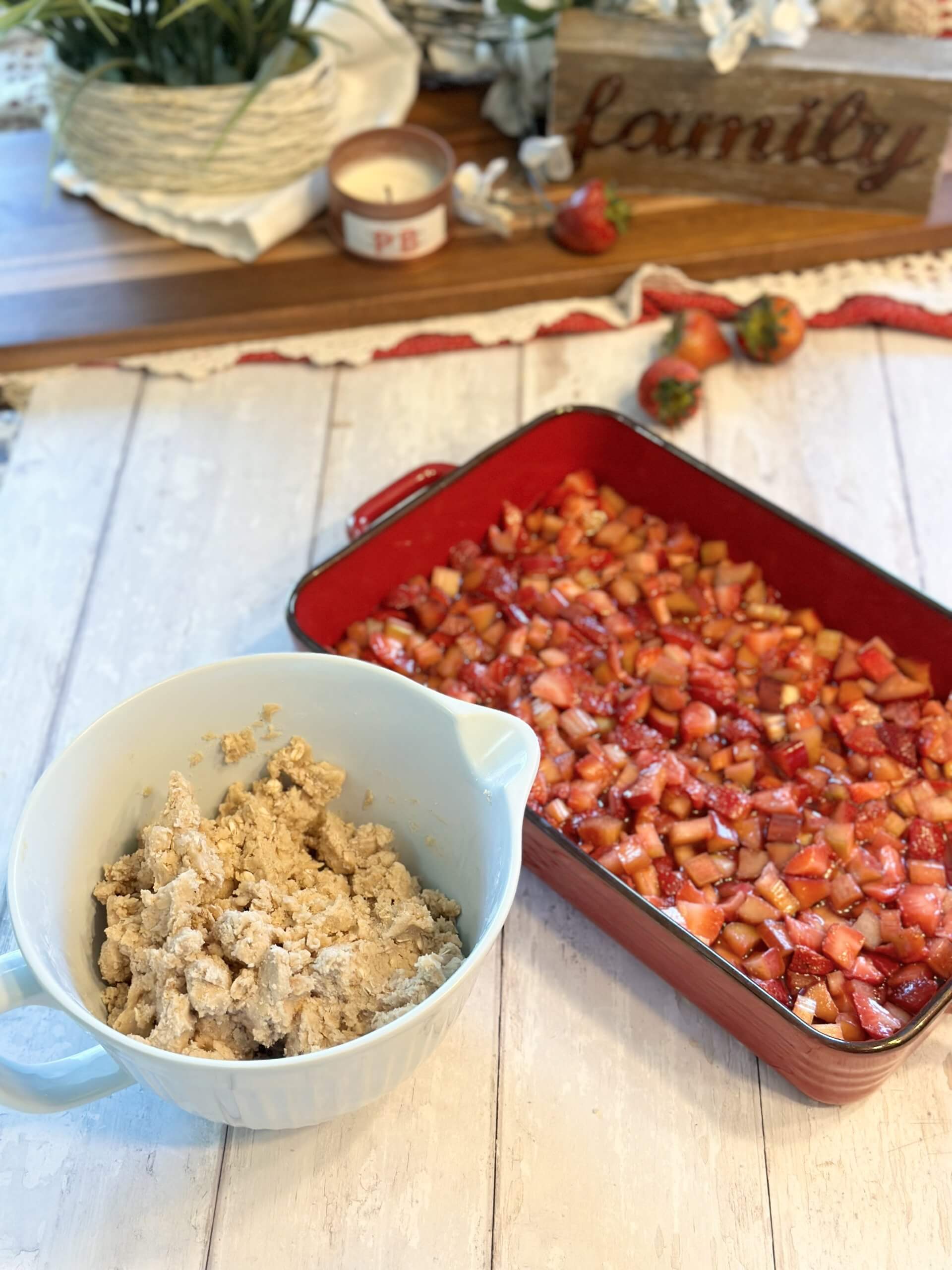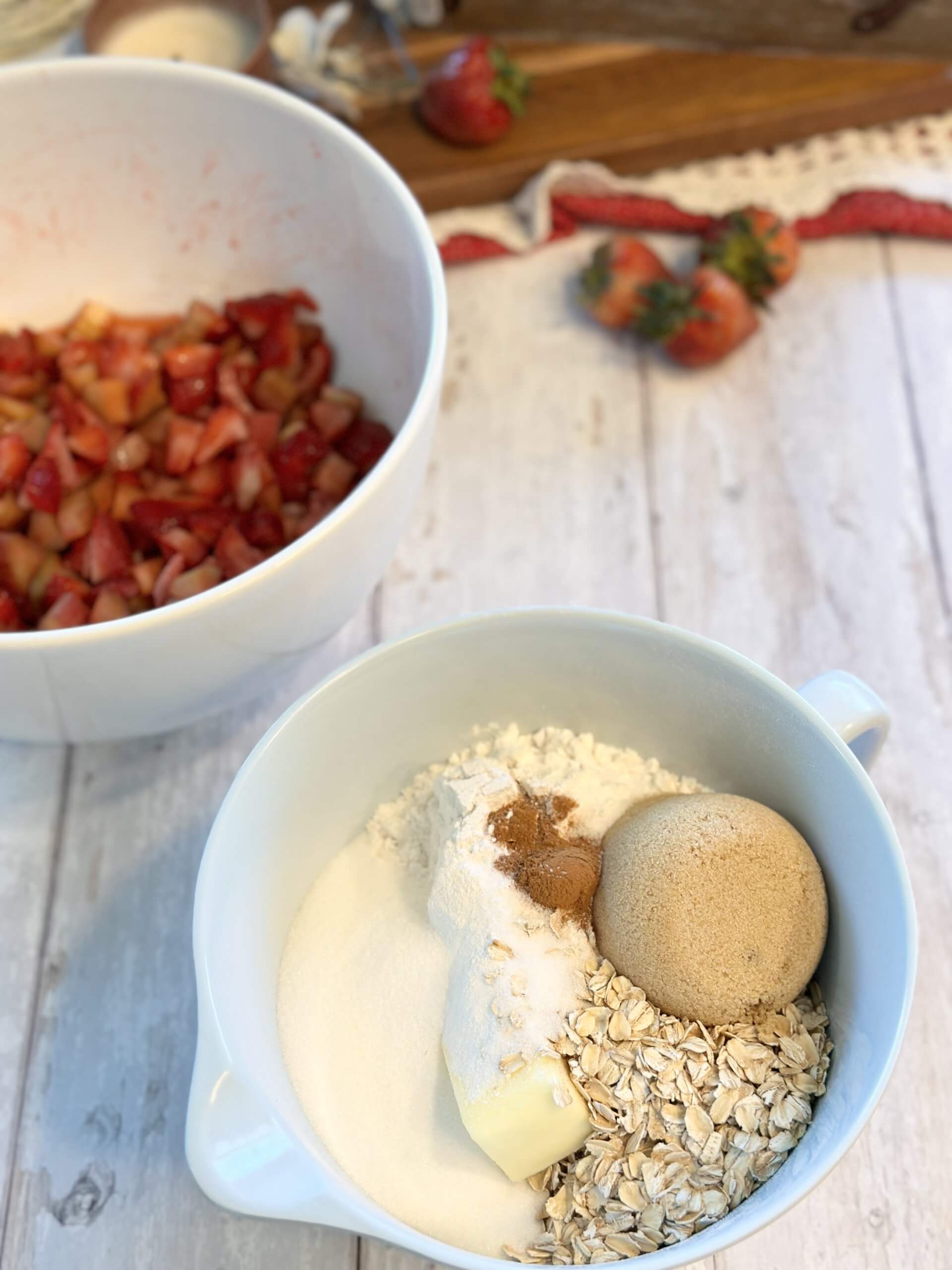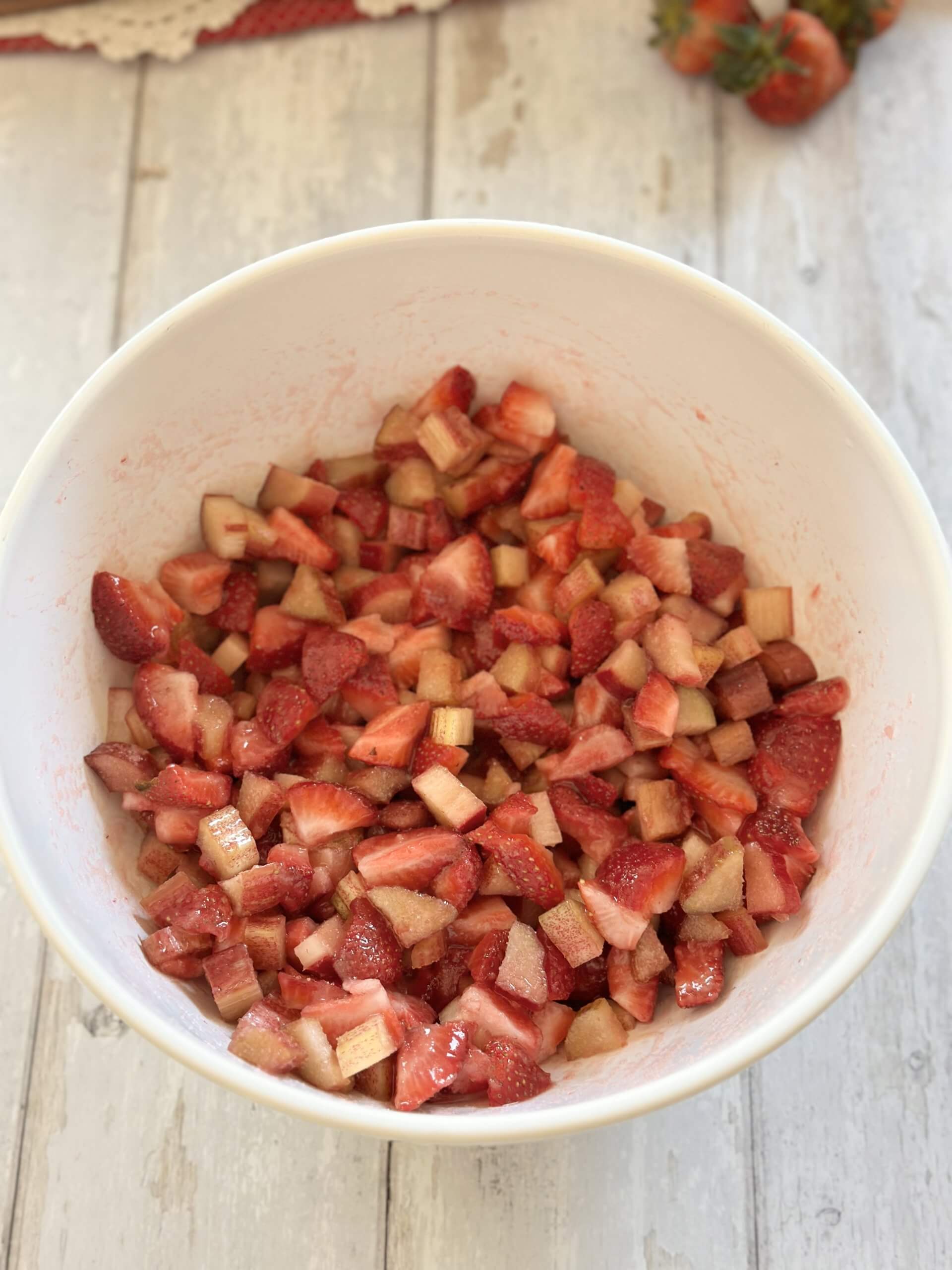 Preheat the oven to 350 degrees. Start by cutting up the rhubarb and berries. Toss together with 1/2 cup of white sugar to help get some juices flowing, also known as macerate. Set it aside while you make the crumb topping.