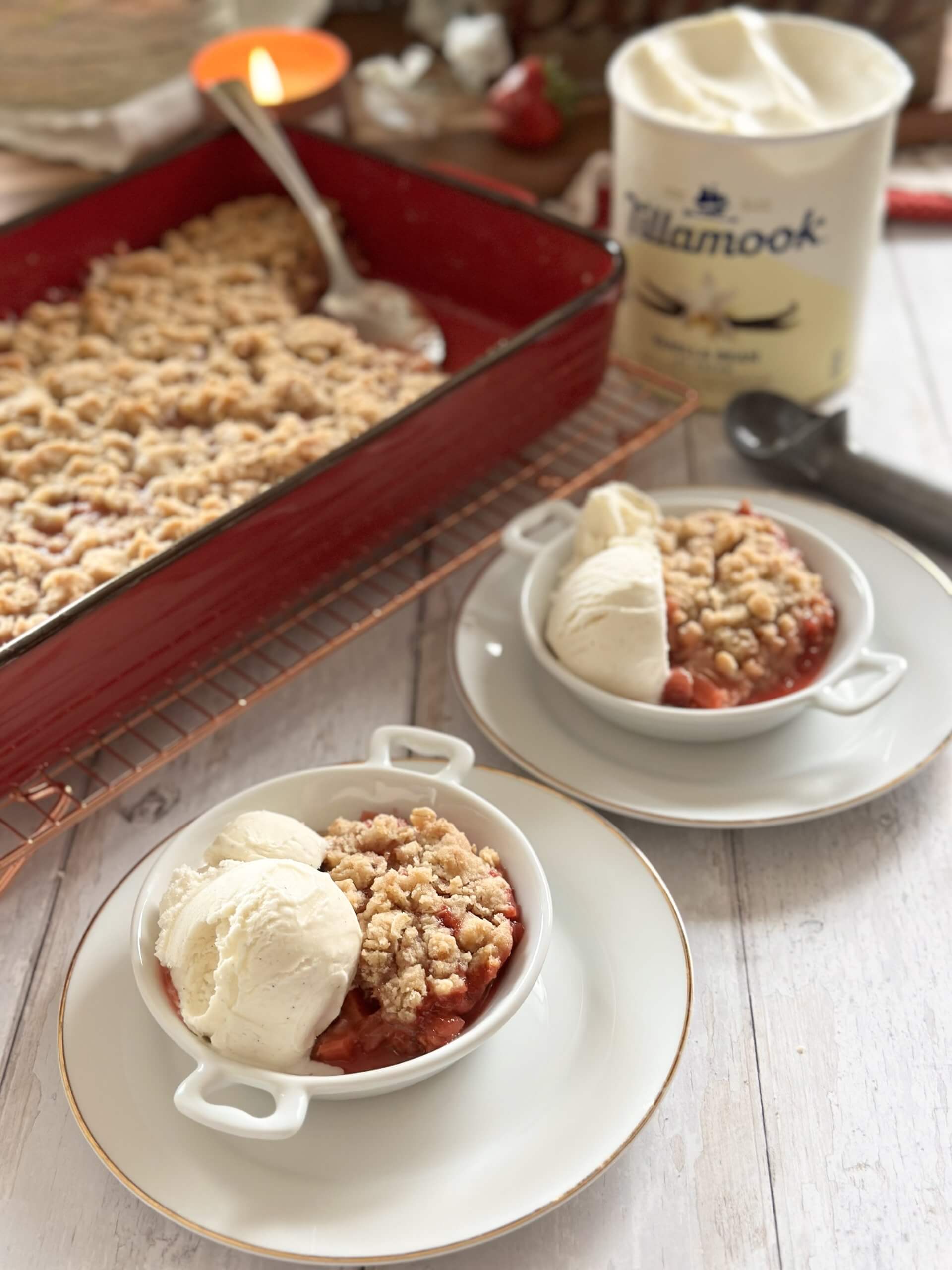 We LOVE Strawberry Rhubarb Crisp MORE than the pie version. We can’t help it! First of all, it IS easier to make. Also, the crumb topping is just so much better than a pie crust. Likewise, we like Apple Crisp more than Apple Pie! Are these unpopular opinions? This is saying A LOT, because we are absolutely PIE PEOPLE! WE LOVE PIE!