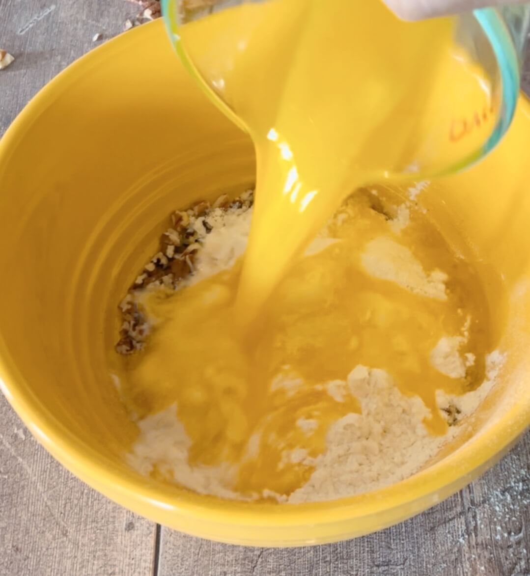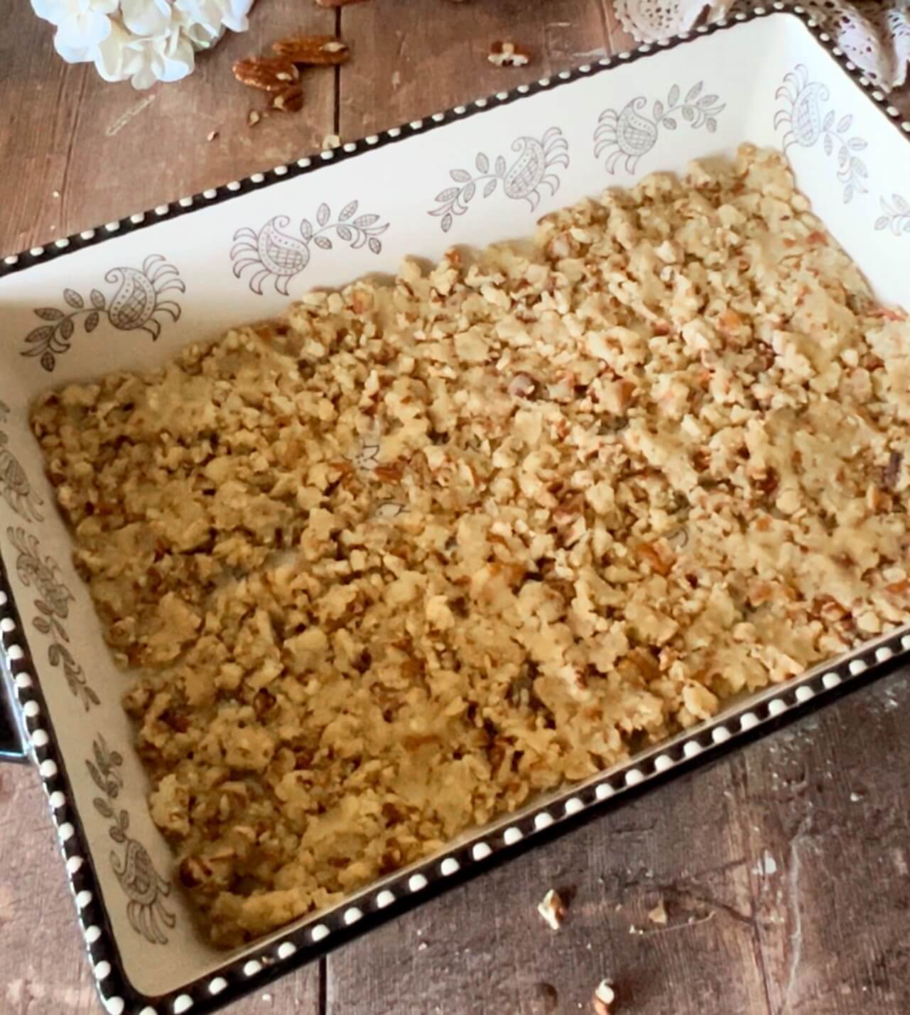 - Add the pecans, flour and butter to a bowl. Mix well. Press into a 9x13 baking dish.
