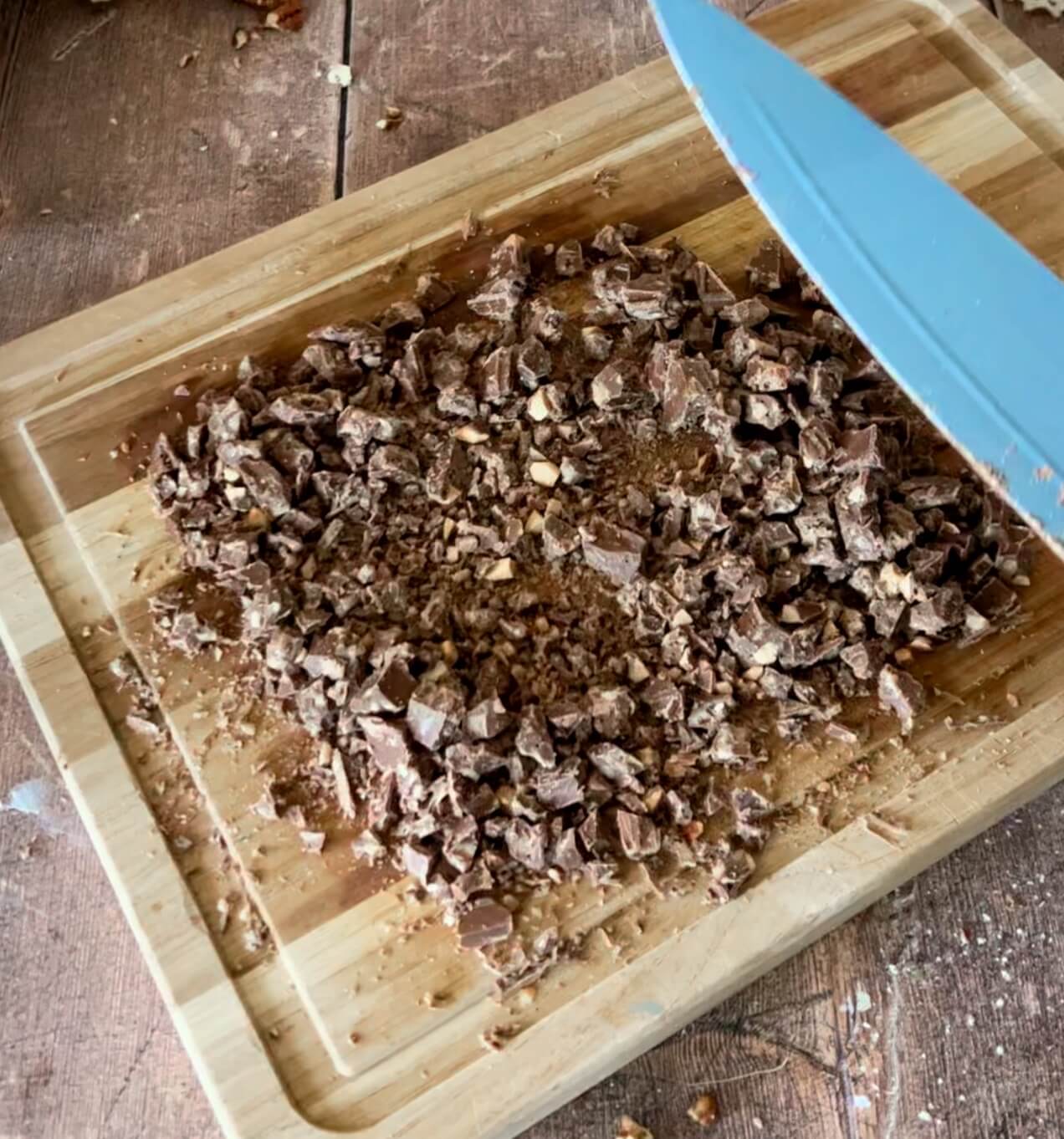 - Chop the chocolate bar into bits and pieces. Sprinkle half on top.