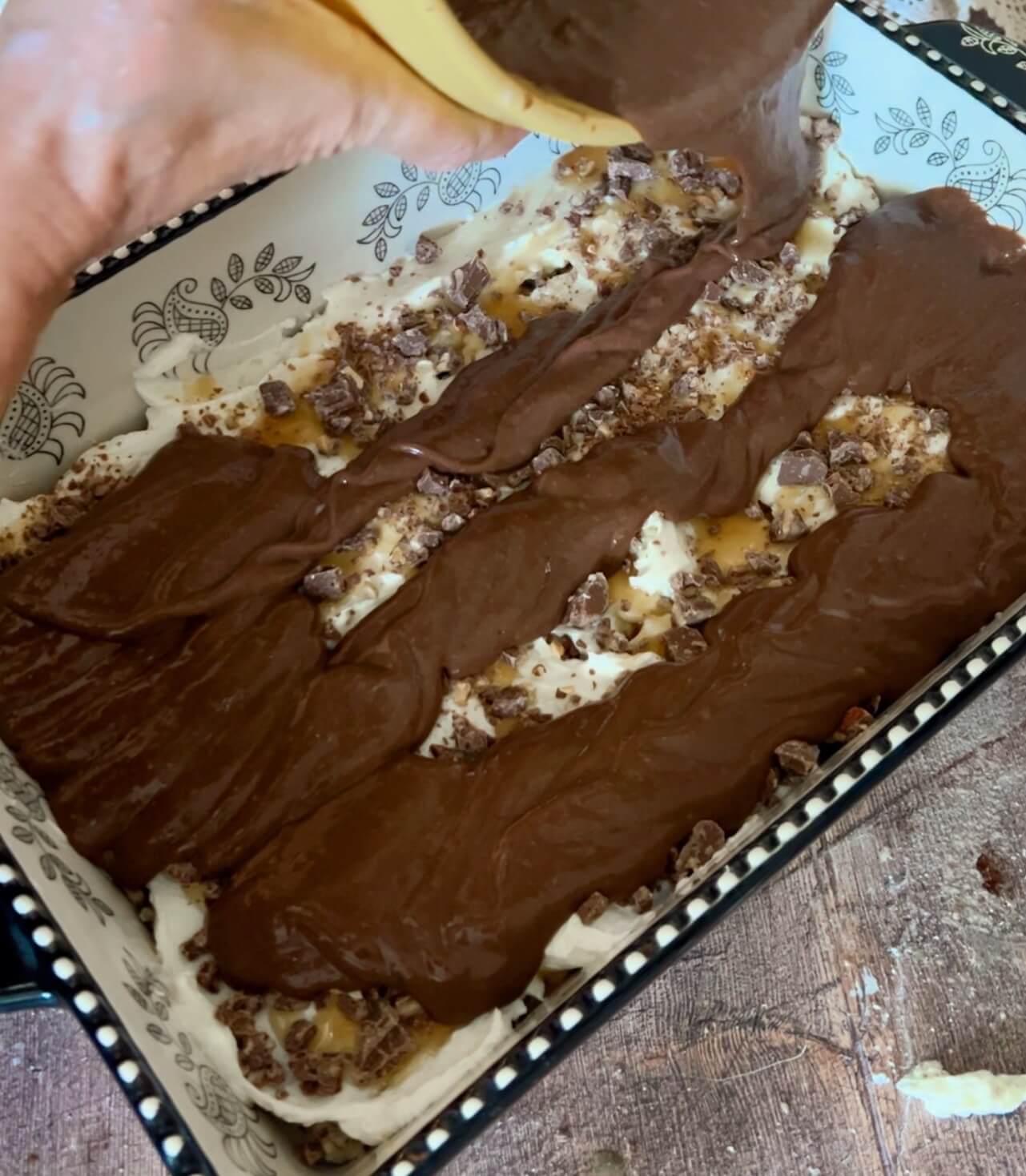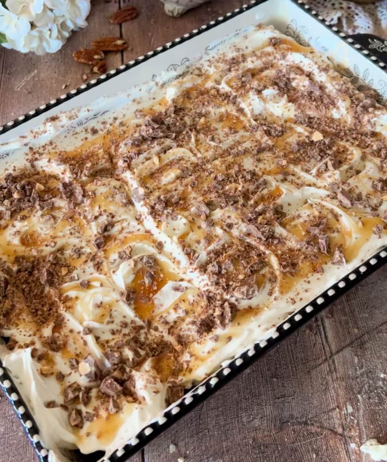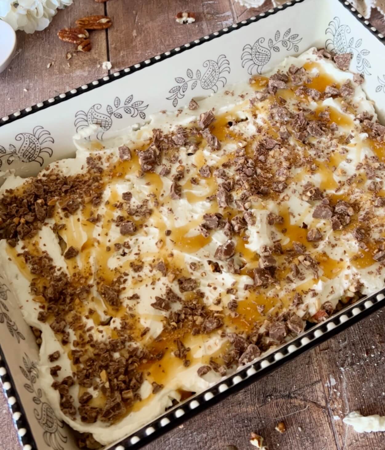 - Drizzle with caramel sauce. Sprinkle on remaining chocolate bar pieces. Cover and refrigerate a couple of hours if you can stand it...or just dig in.