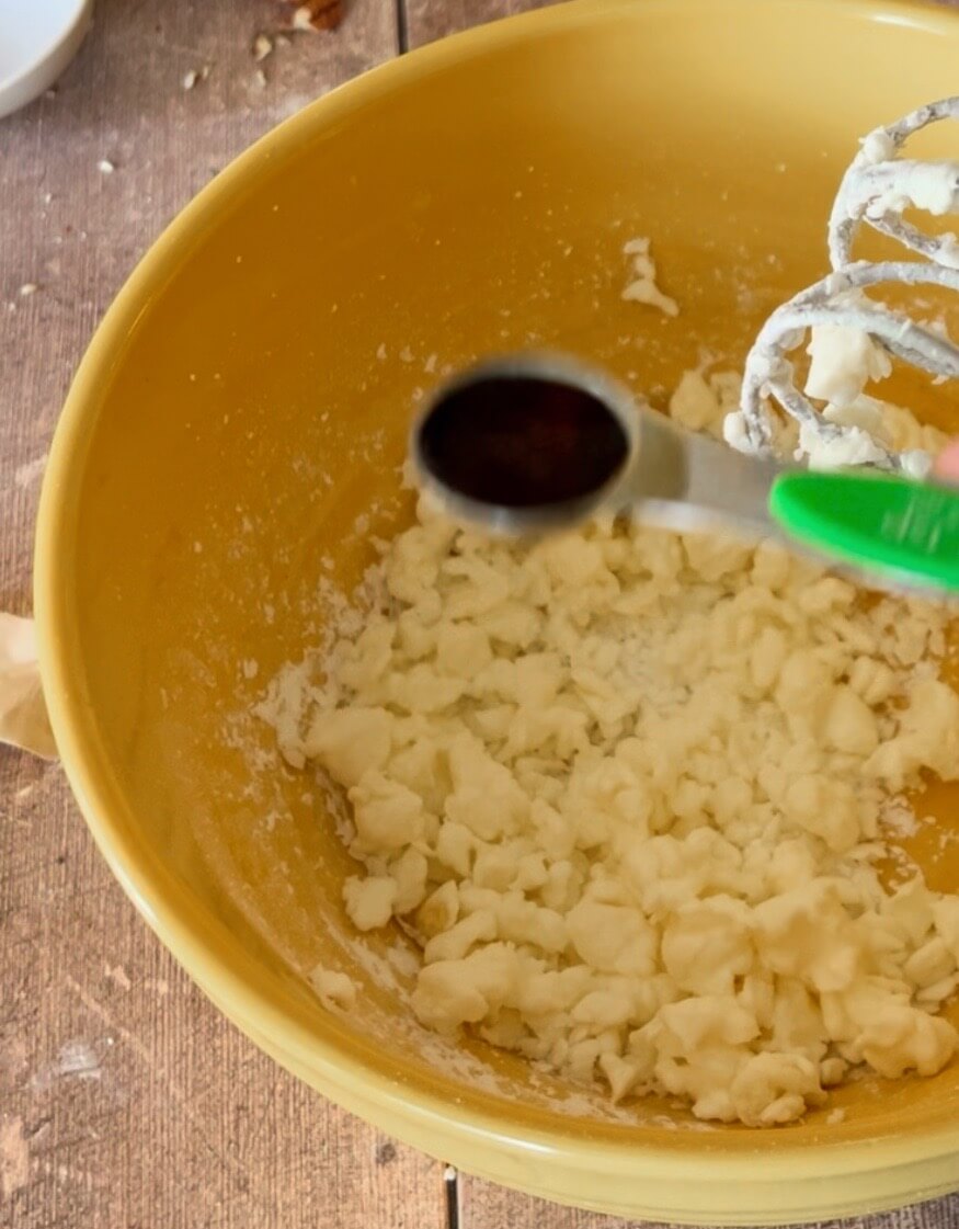 - Whip together cream cheese, powdered sugar and vanilla.